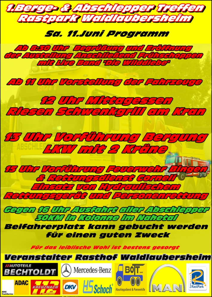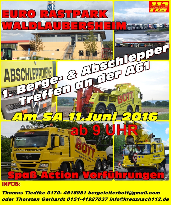 Waldlaubersheim - Zum 1. Berge- und Abschlepper Treffen lädt der Rasthof Waldlaubersheim am Samstag 11.Juni 2016 ein. Der Bergeleiter Thomas Thiedke von der Fa.Bott Abschleppdienst hatte diese Idee
