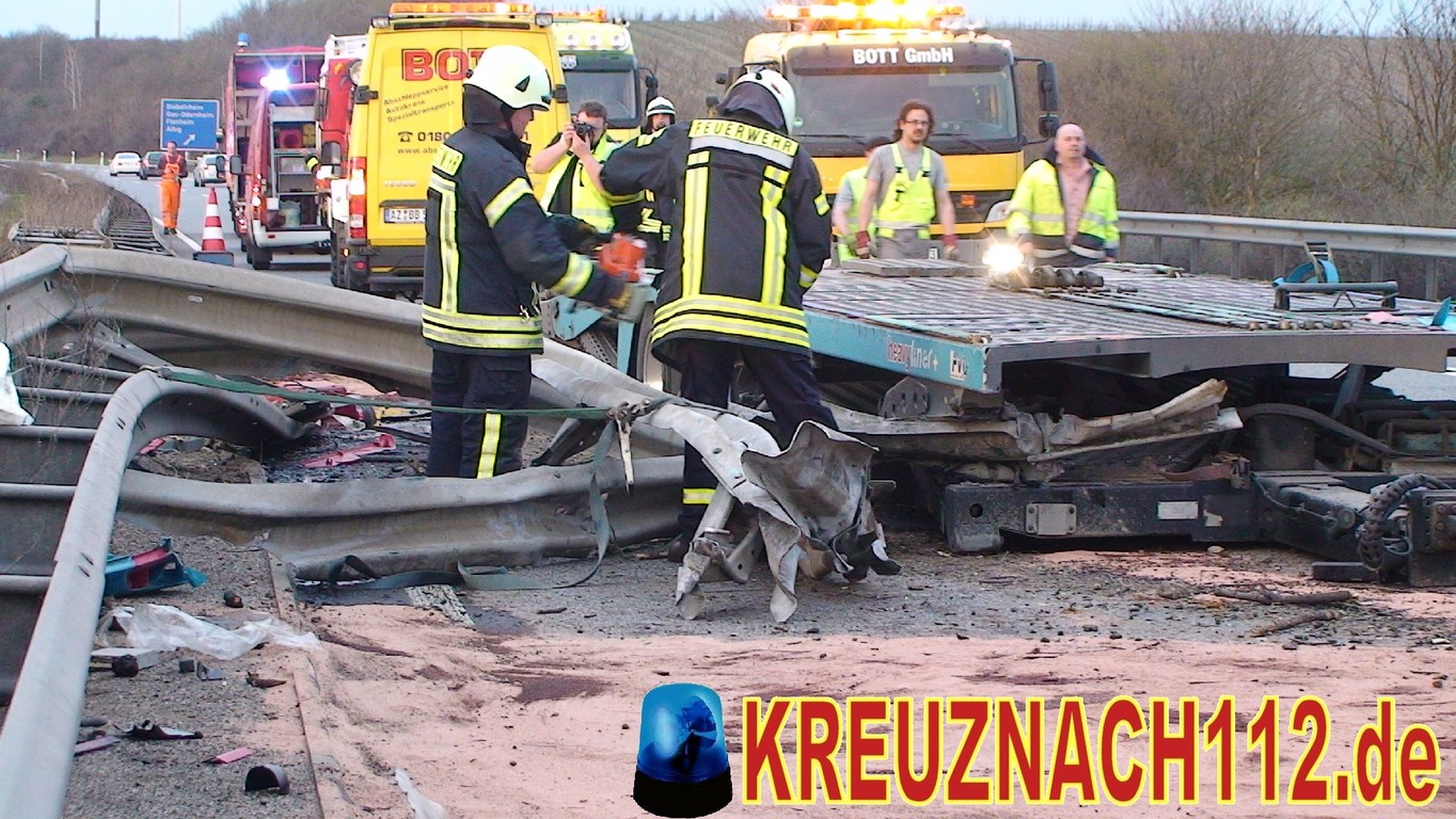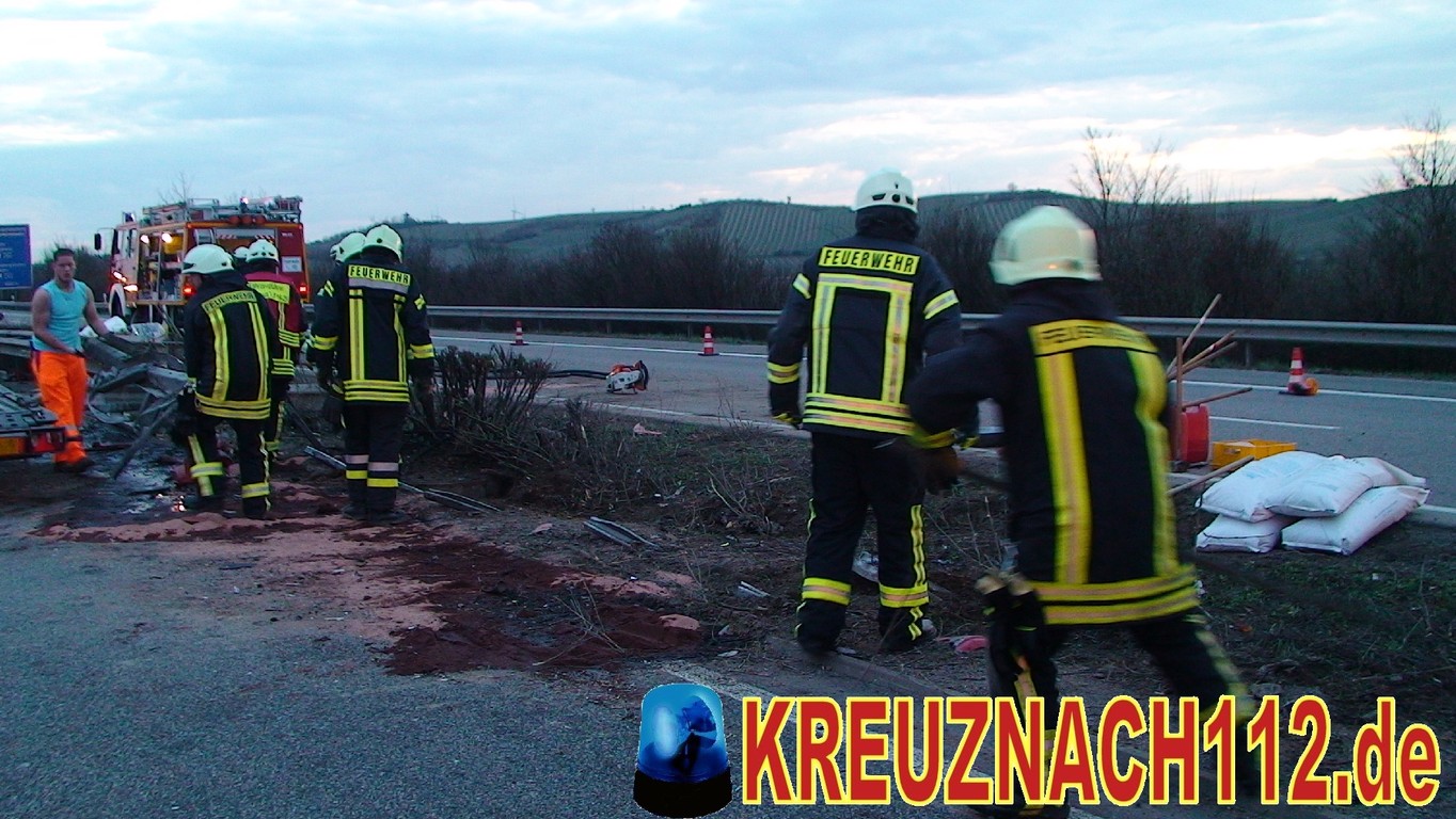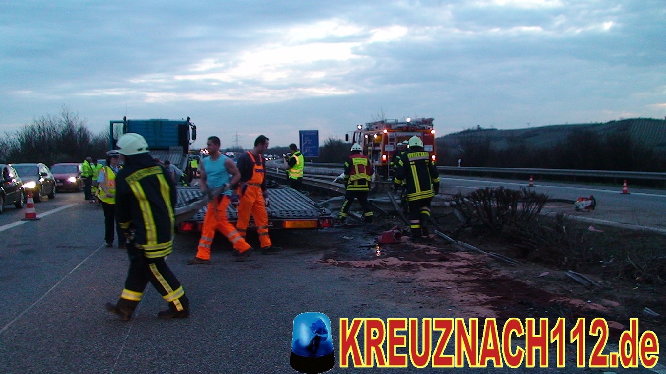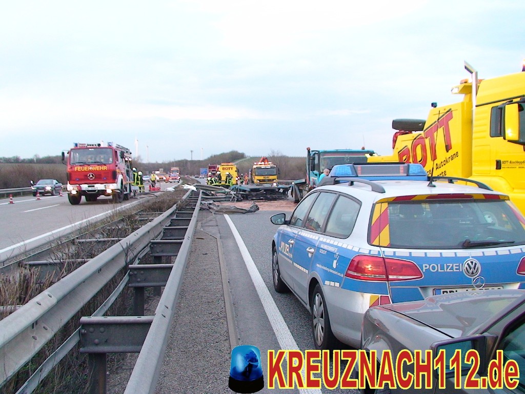 Verkehr wurde über die Anschlussstelle Bad Kreuznach umgeleitet. Die Aufräumarbeiten dauerten bis circa 4 Uhr an. Bis voraussichtlich 8.30 Uhr soll die Autobahn zur Spurensicherung im Hellen noch