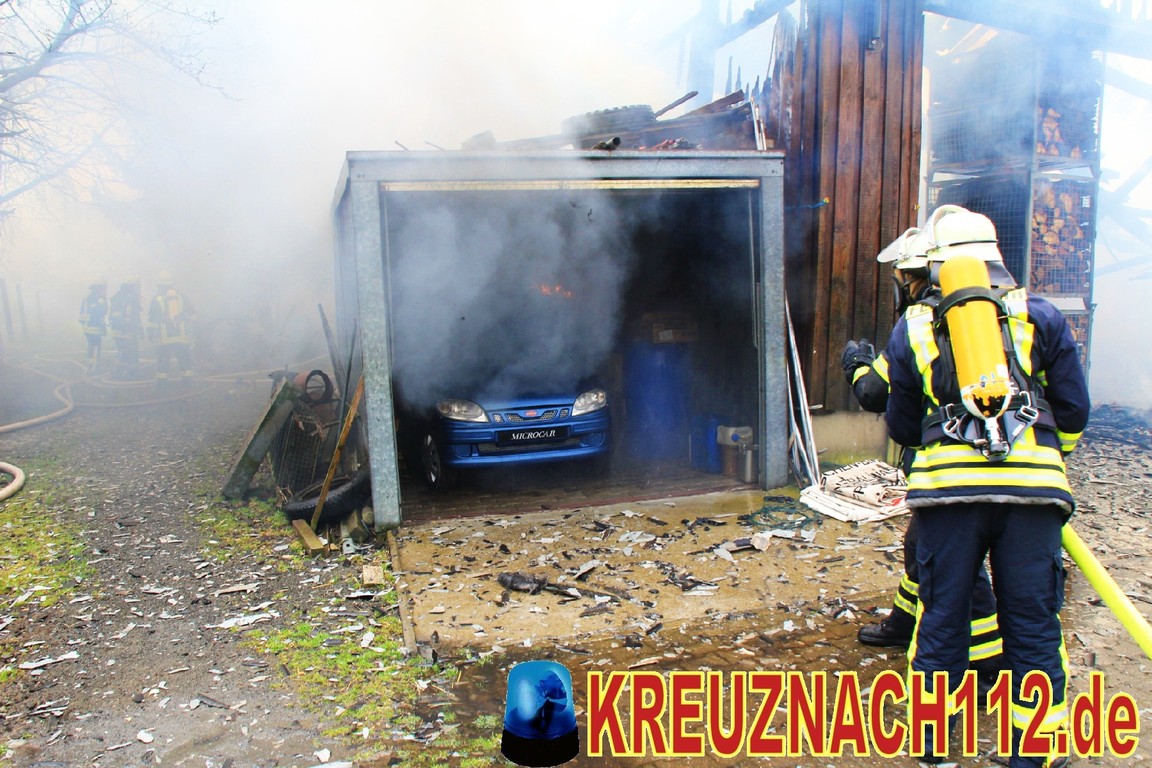 Die zwei Hausbewohner, ein älteres Ehepärchen wurden durch den Nachbar über den Brand informiert, der durch einen Knall über den Brand aufmerksam wurde. Der Hausbesitzer lief direkt aus seinem Wohnhaus. Der Geräteschuppen, der an die Garage angebaut war brande lichterloh. Er wollte sein Auto retten, bei der etwas hektischen Rettungsaktion beschädigte er den PKW leicht. Dort gelagertes Gartenwerkzeuge, Feuerholz, & die Grillstelle war aus bisher ungeklärter Ursache in Brand geraten und musste von der Feuerwehr gelöscht werden. Die bei den Löscharbeiten mit mehreren Strahlrohren und schwerem Atemschutz vorging.