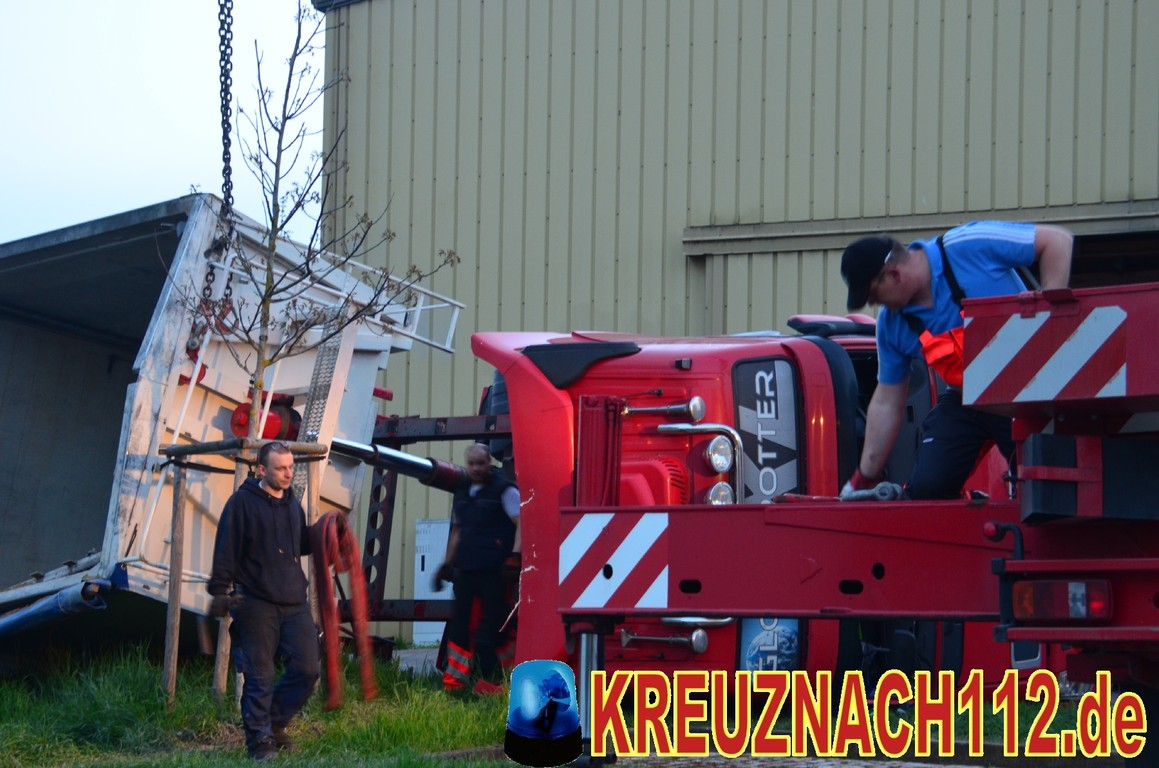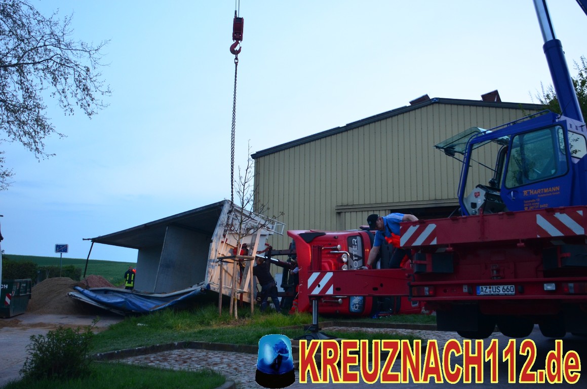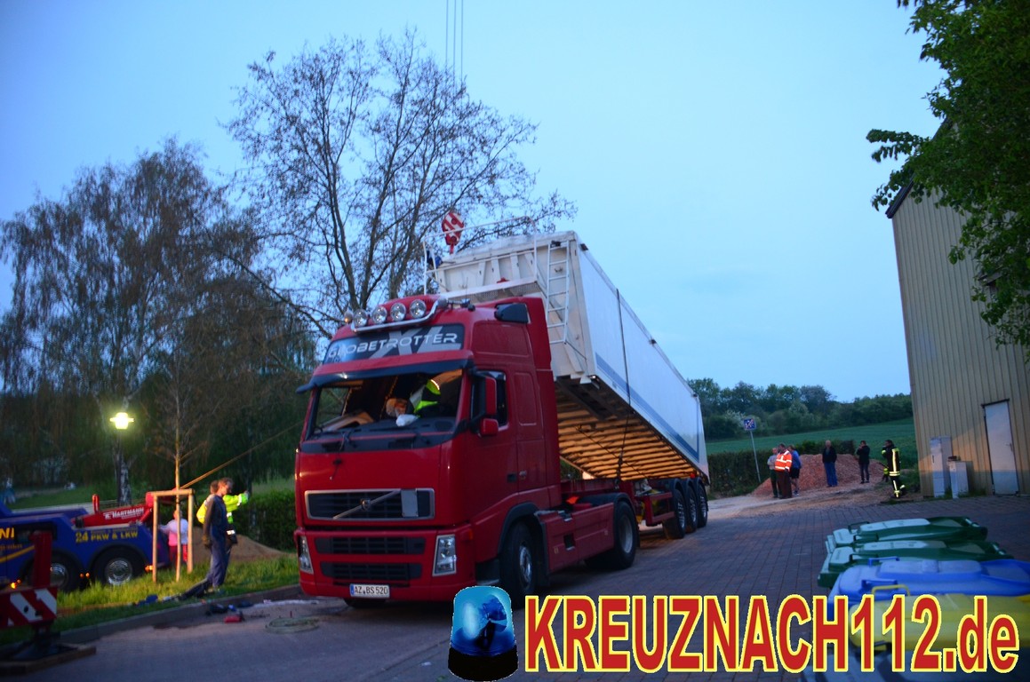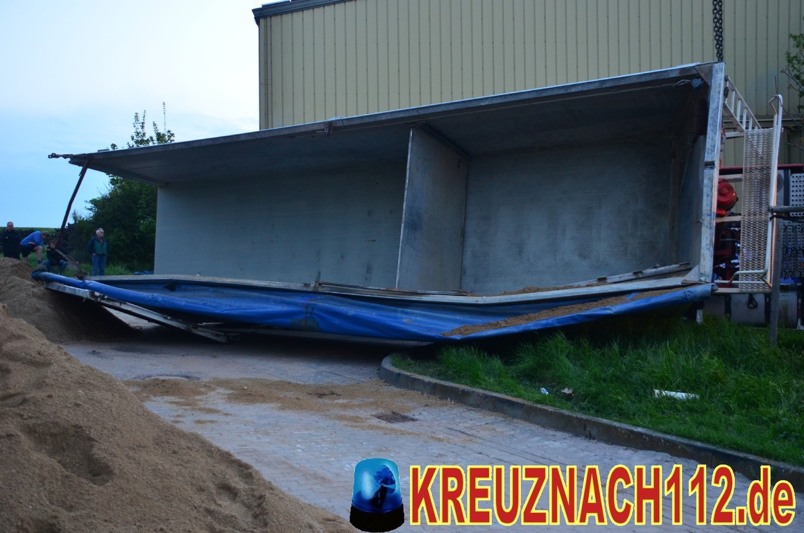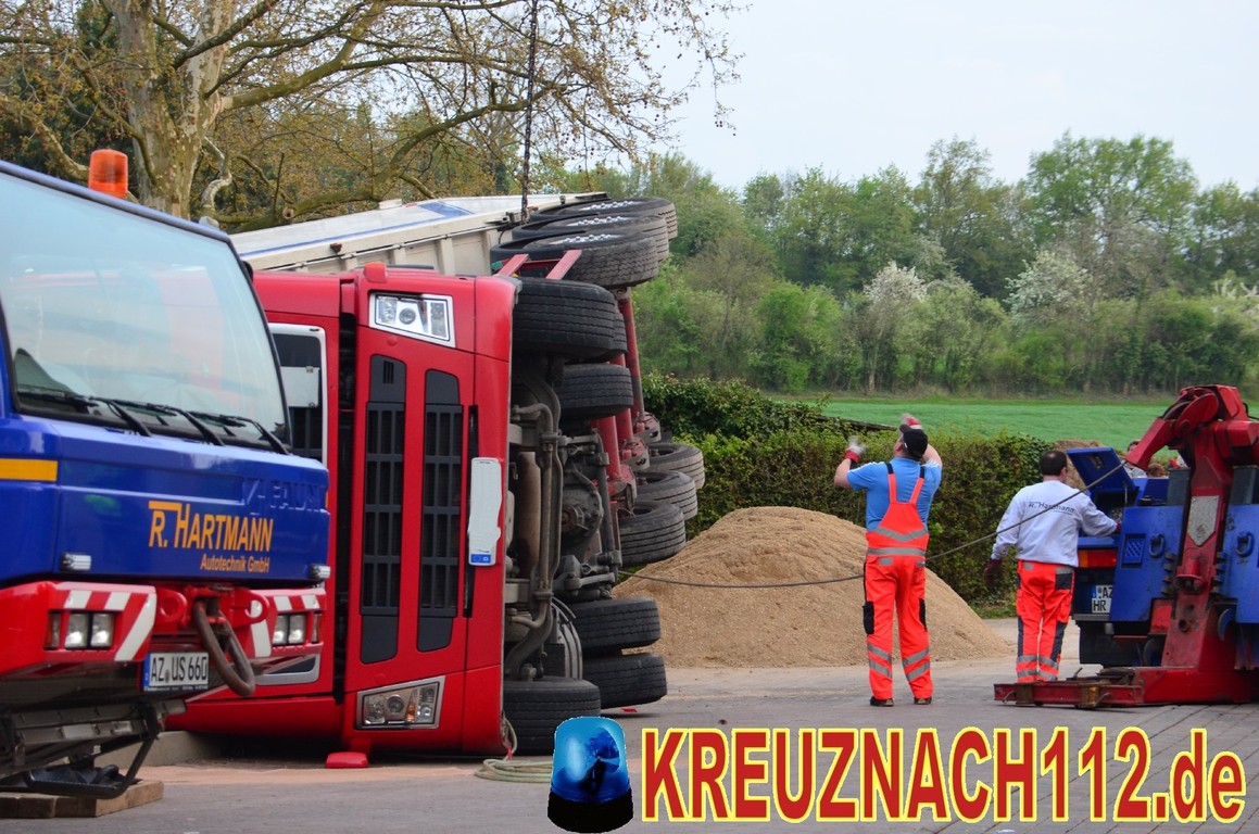 Abladen von Sand fiel ein 40 Toner einer Spedition aus Flonheim am Friedhof um. Dabei Verletzte sich der Fahrer schwer, er musste mit dem Rettungshubschrauber Christoph77 in ein Krankenhaus nach
