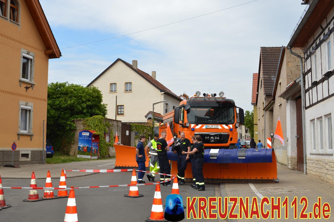 für den Autoverkehr als auch für Anwohner. Mehrere Dörfer waren am Abend vorübergehend von der Wasserversorgung abgeschnitten.Gegen 20 Uhr schoss das Wasser durch das Erdreich und spülte Sand und