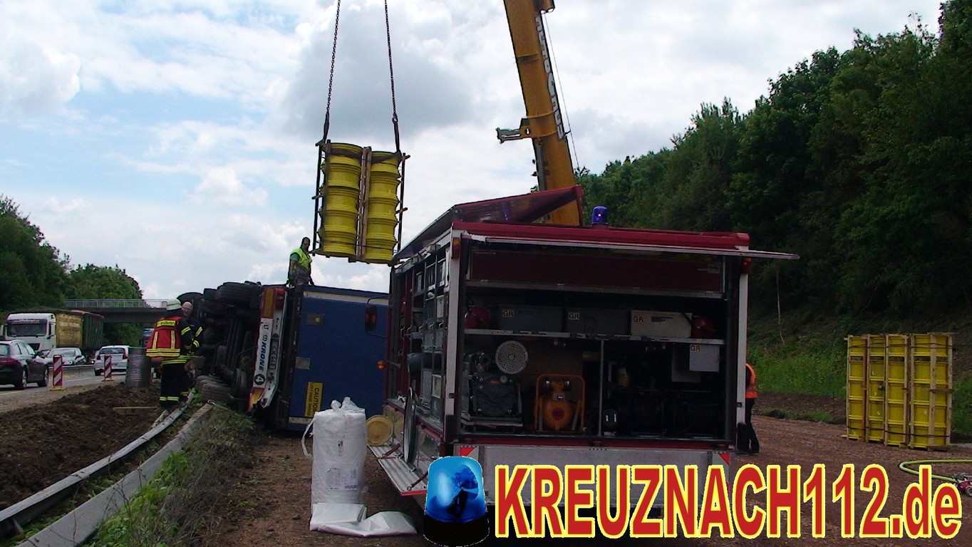 Ein LKW beladen mit Traktorfelgen stürtze in der Baustelle auf der A61 zwischen Gundersheim und Worms/Mörstadt um. Der Fahrer wurde