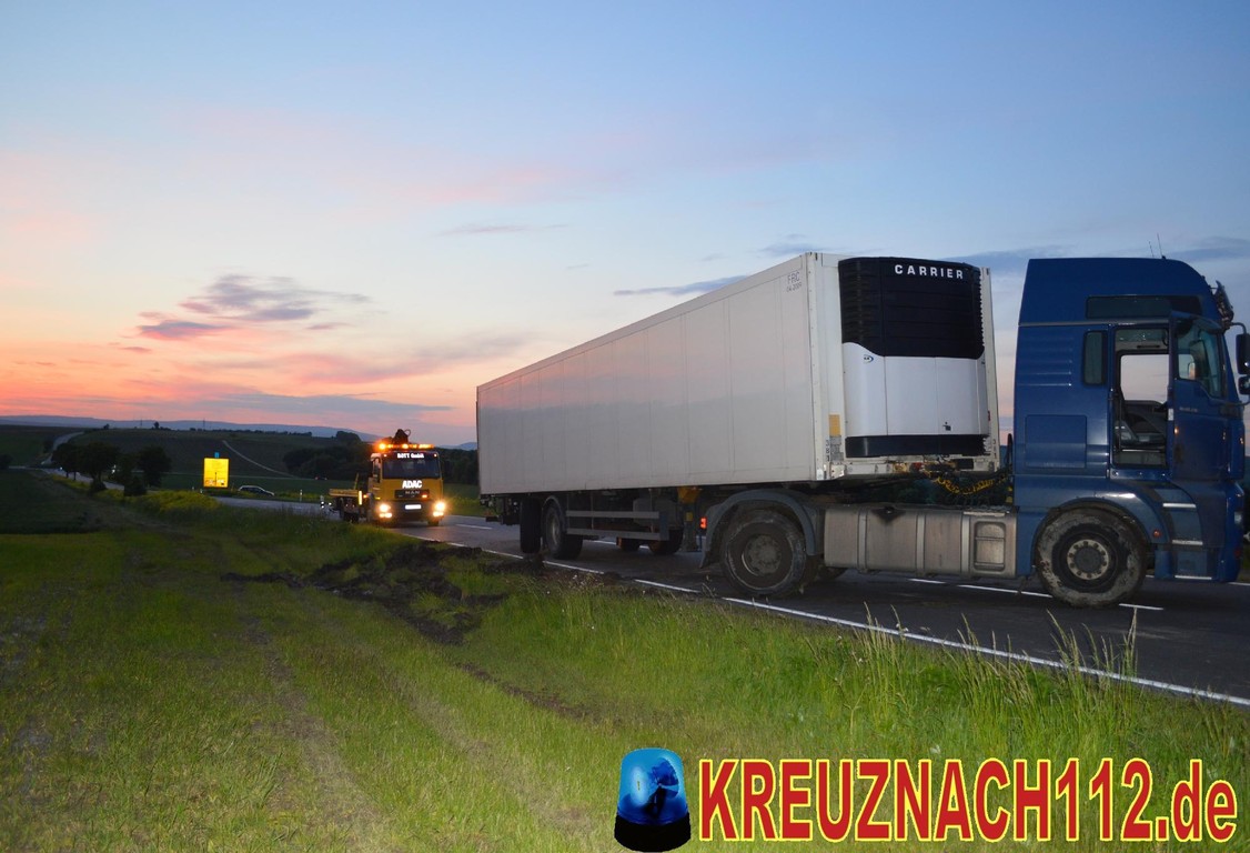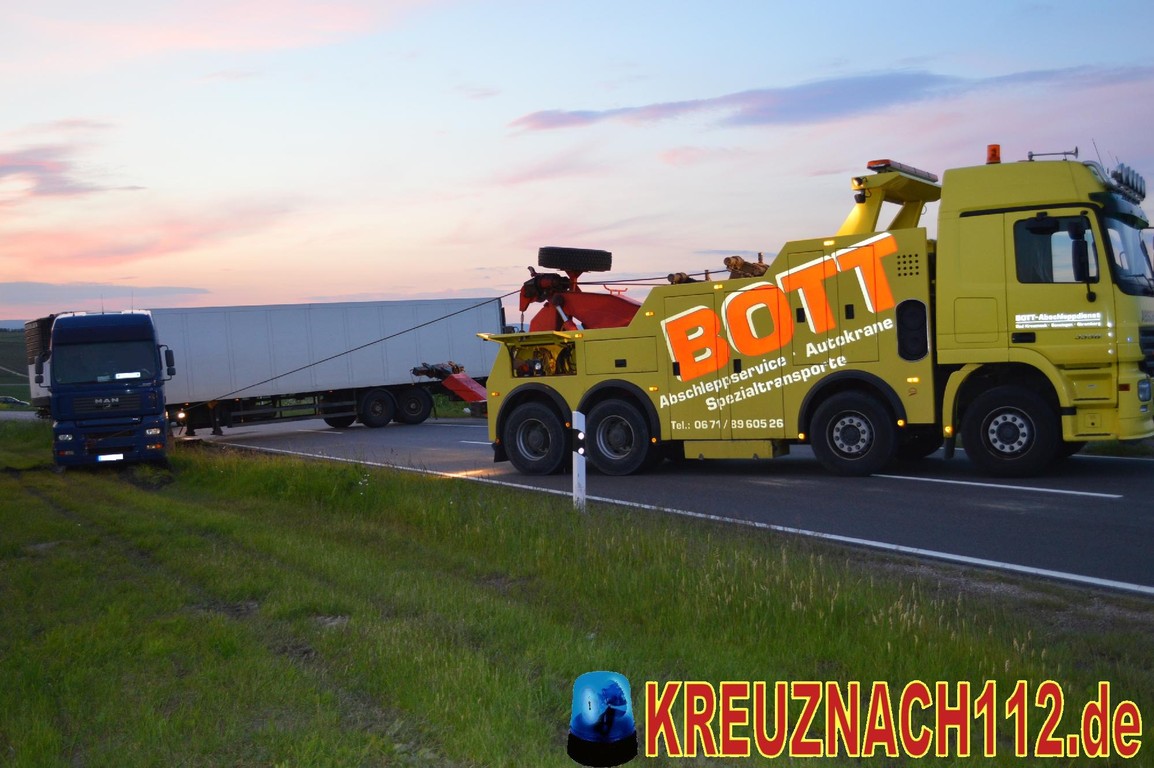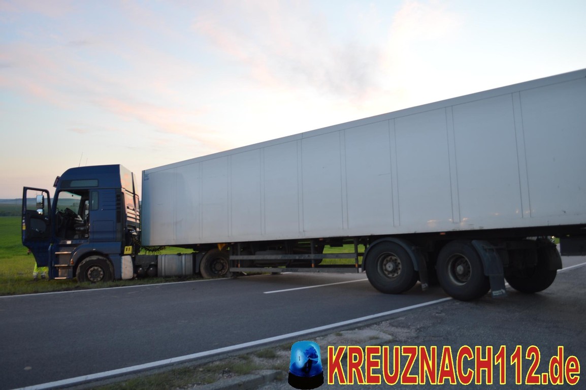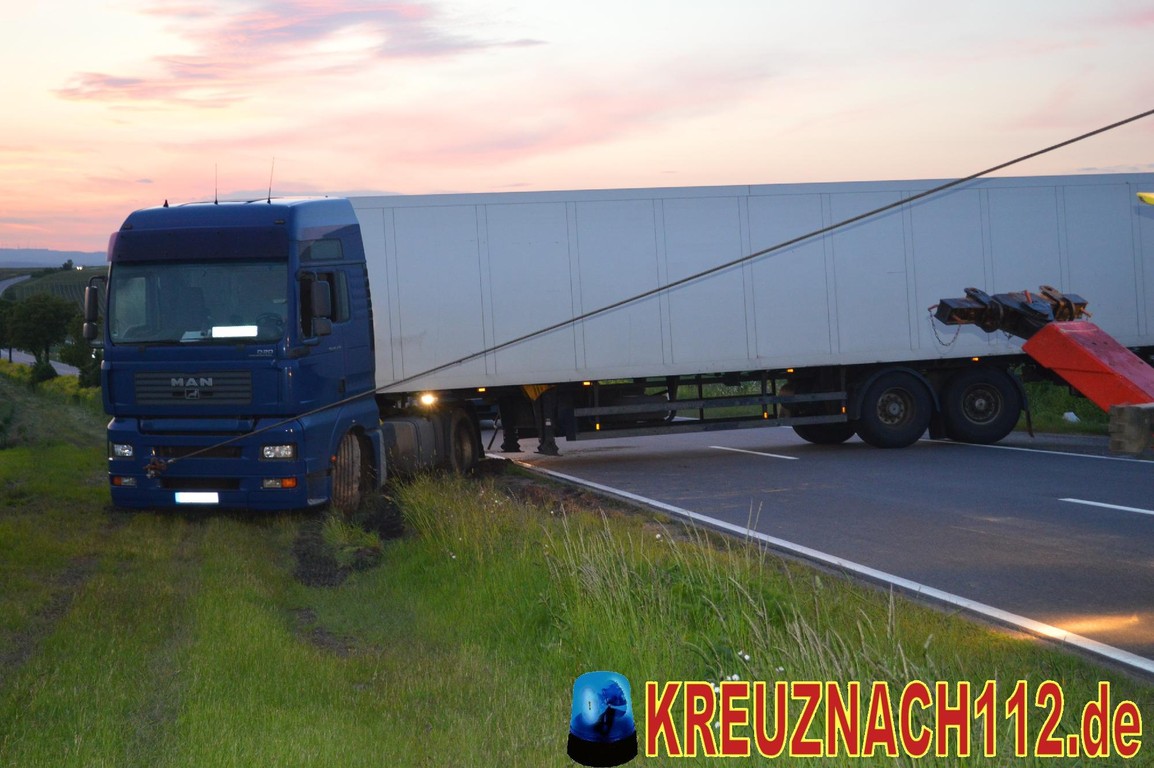 28.05.2013 LKW Trailer quer auf B50 (höhe Badenheim) und Zugmaschine im Graben. Reportage Christopher Stumpf