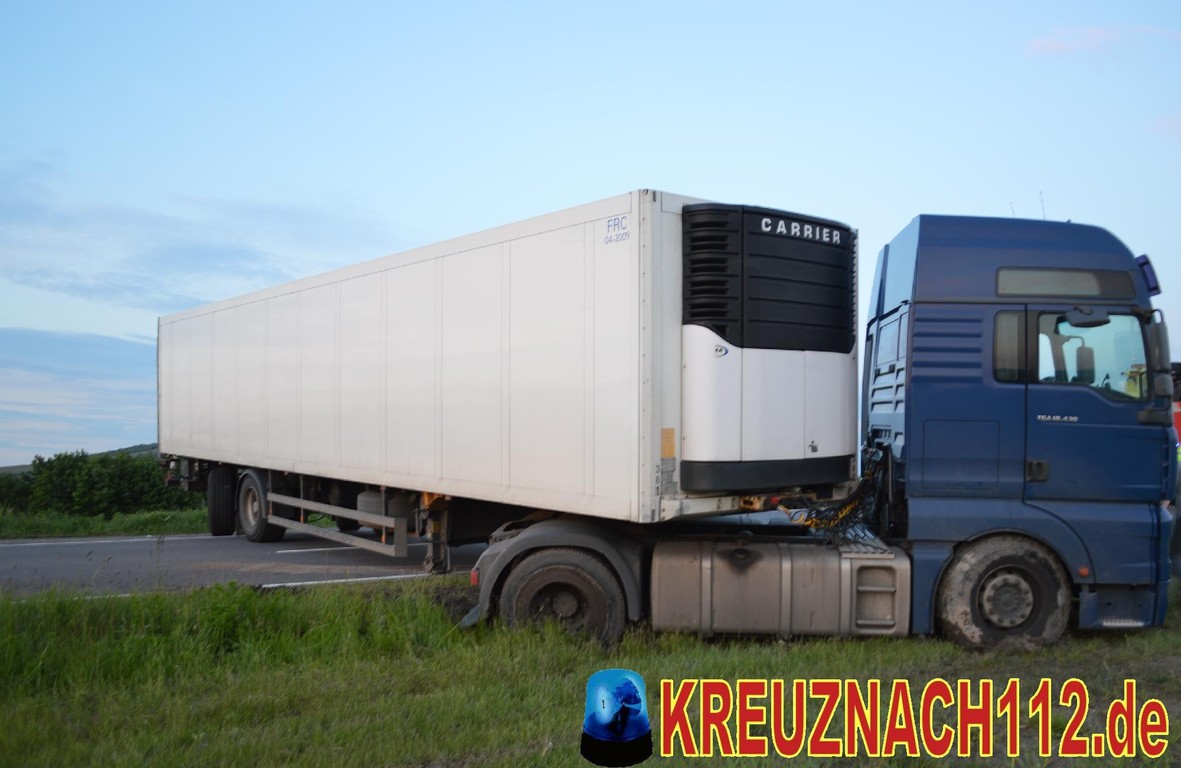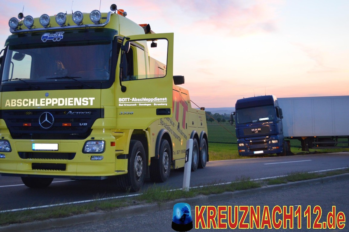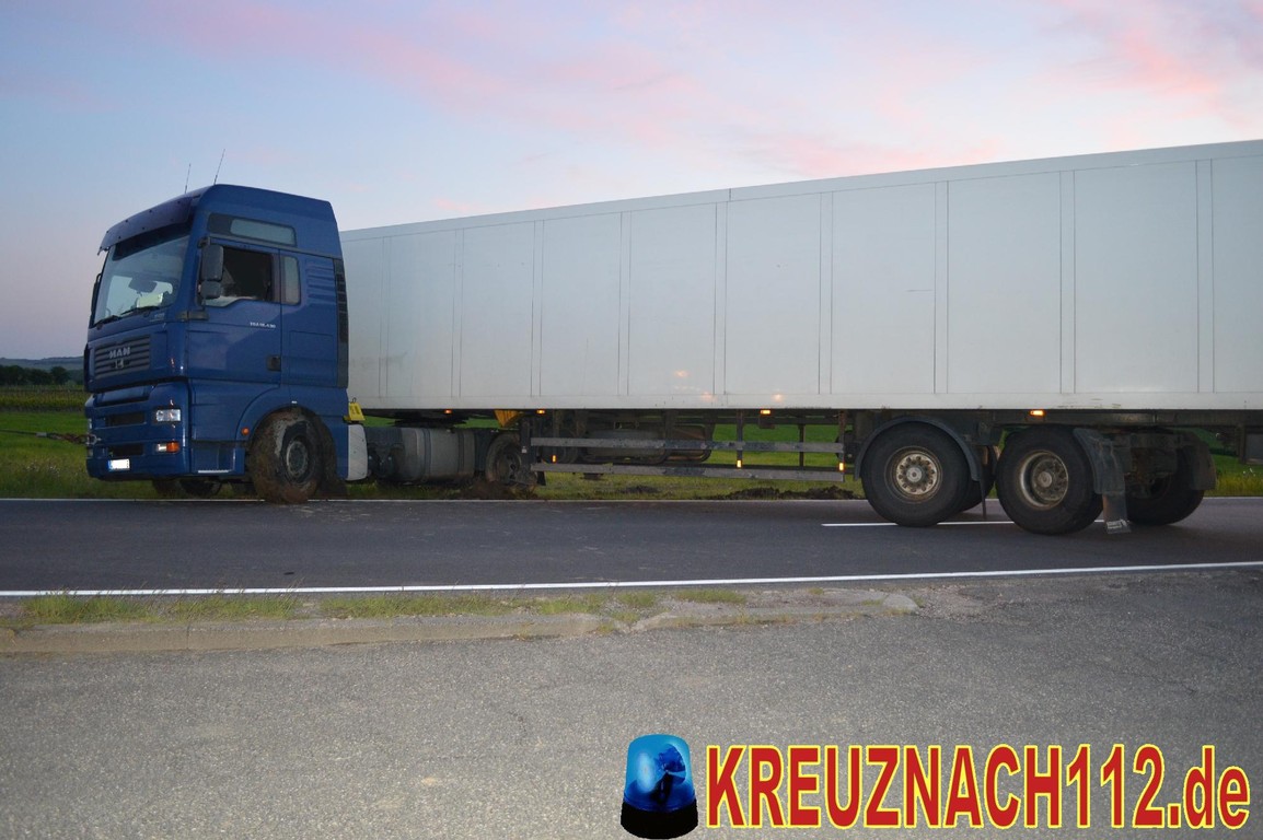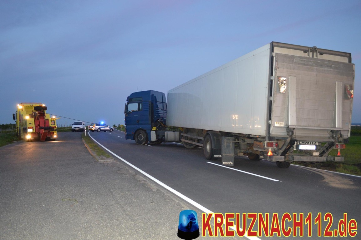 28.05.2013 LKW Trailer quer auf B50 (höhe Badenheim) und Zugmaschine im Graben. Reportage Christopher Stumpf