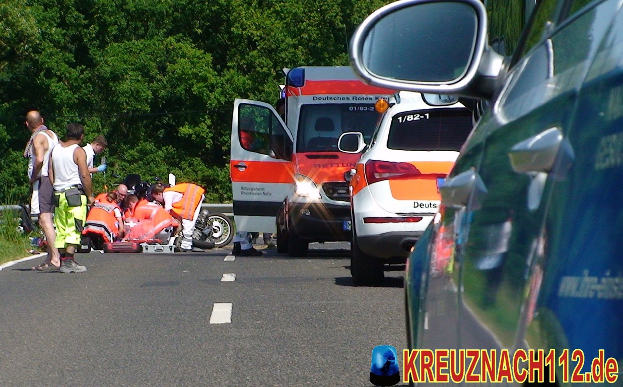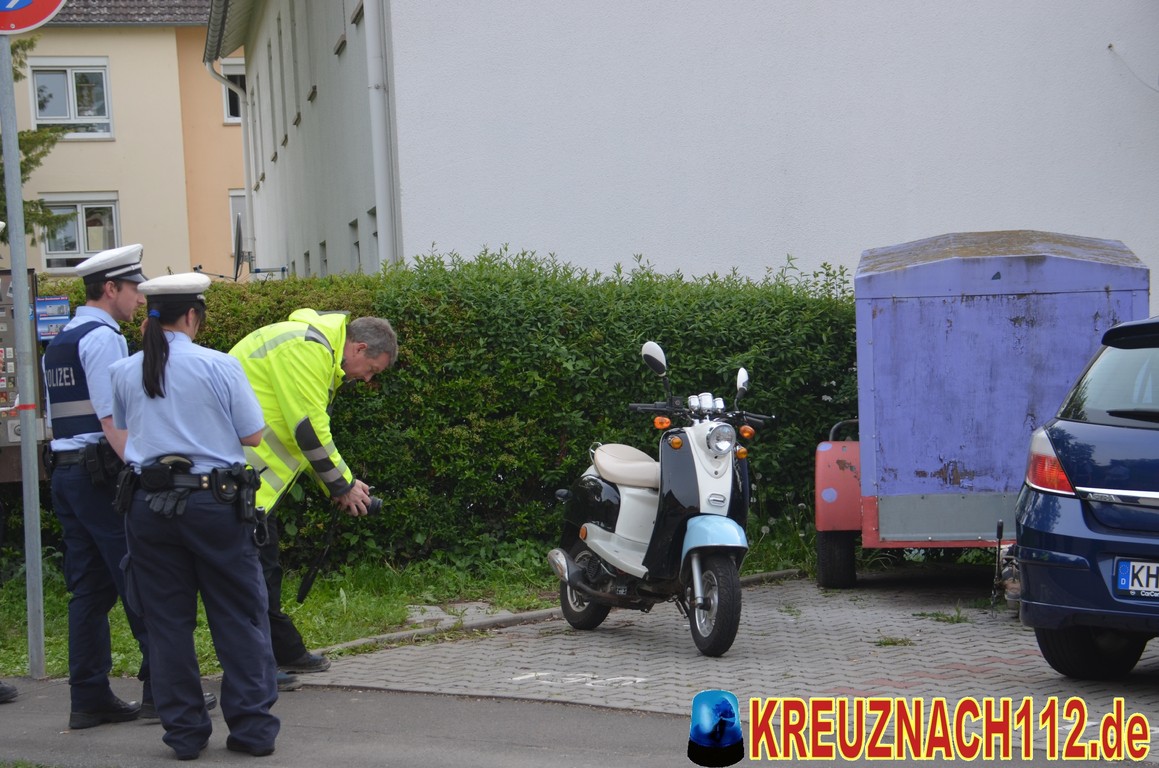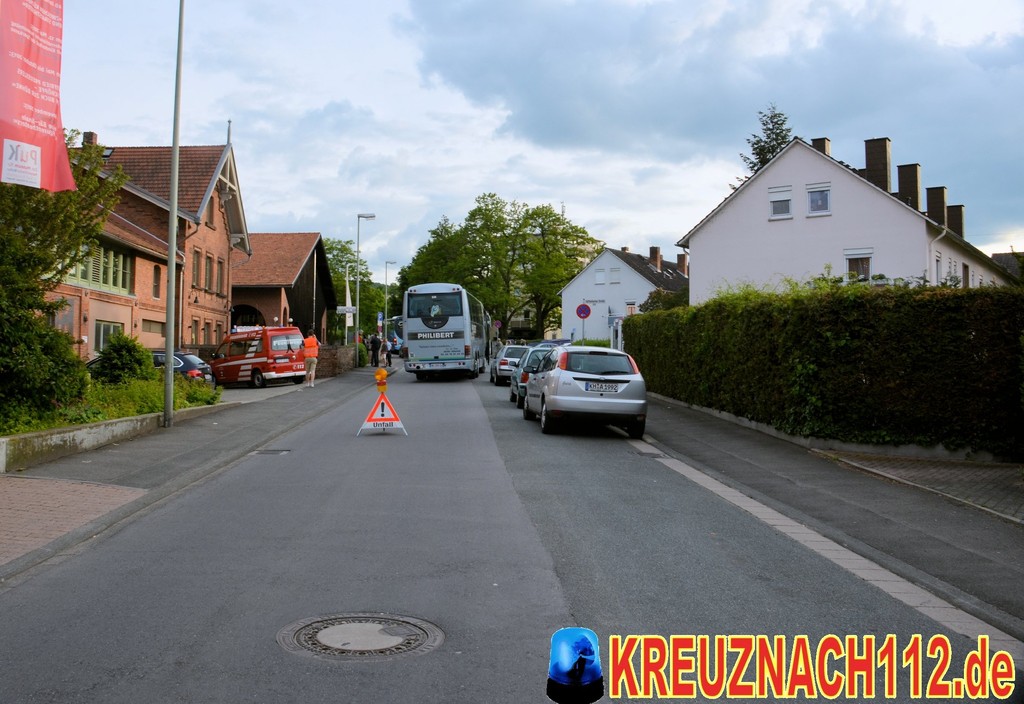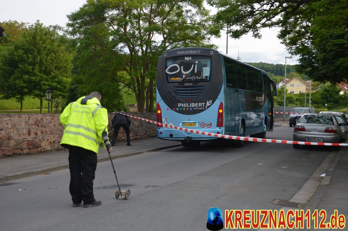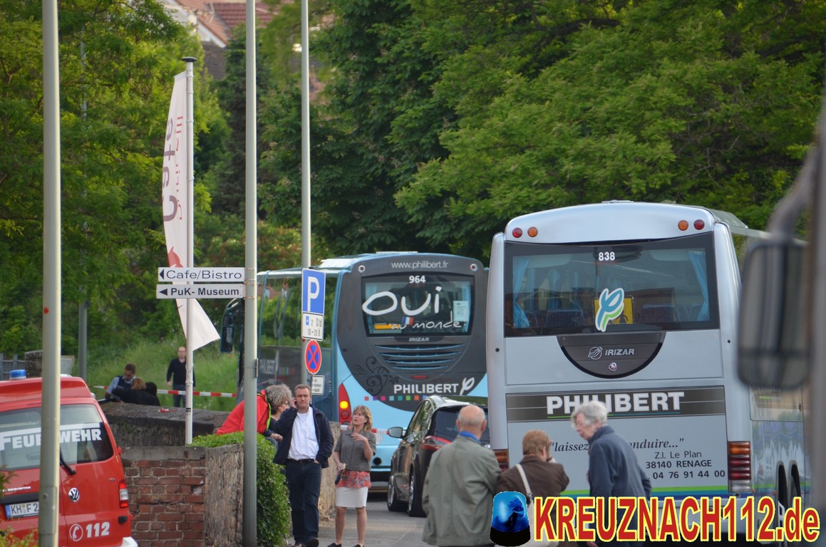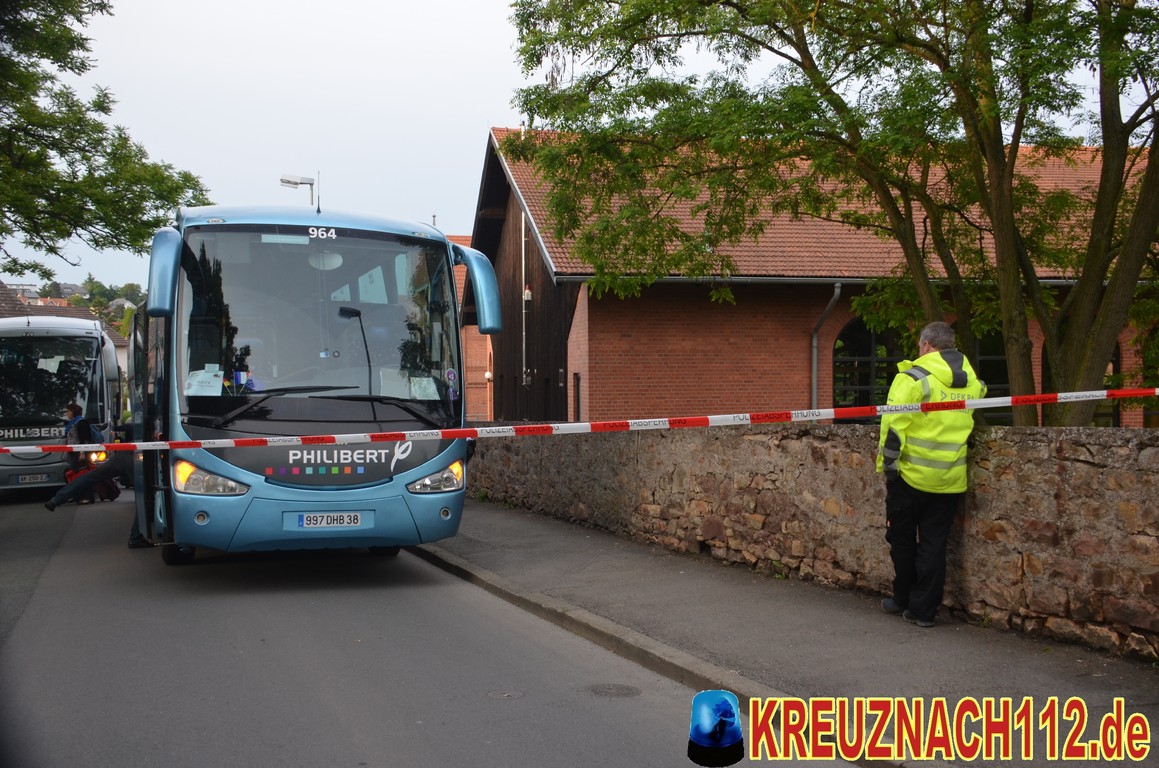 30.05.2013 Tödlicher Roller Unfall an der Römerhalle in Bad Kreuznach Reportage Thorsten Gerhardt In den Unfall, der sich nach Angaben der Polizei gestern Abend um 18.10 Uhr in der Hüffelsheimer Straße ereignete, war einer der Reisebusse aus Bourg-en-Bresse (Partnerstadt von Bad Kreuznach) verwickelt. Nach ersten Erkenntnissen soll sich der Fahrer des Busses verfahren haben. In Höhe der Römerhalle kam es dann zu dem folgenschweren Zusammenprall. Der 54-jährige Zweiradfahrer soll aus bislang ungeklärten Gründen von einem Grundstück kommend in die Hüffelsheimer Straße eingebogen sein, ohne auf den fließenden Verkehr zu achten. Nach Zeugenangaben habe er keinen Helm getragen, sondern diesen lediglich am Lenker mitgeführt. In dem Bus befanden sich auch viele Feuerwehrleute die auch als Rettungssanitäter ausgebildet sind. Diese leiteten auch sofort die Reanimation und Erstversorgung ein.