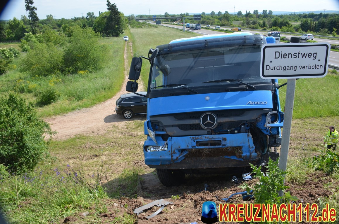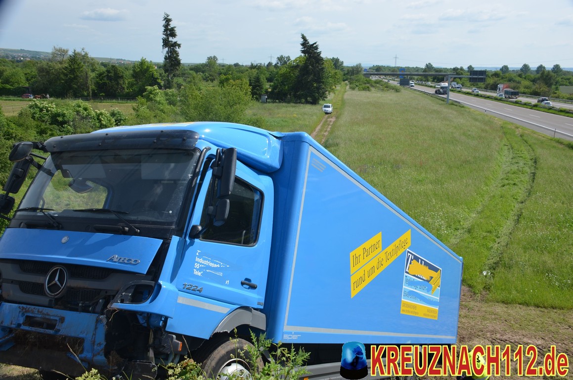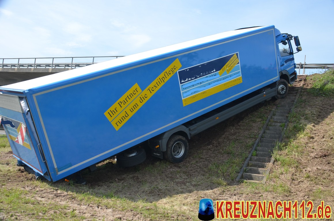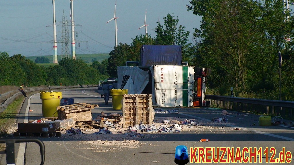 03.06.2013 LKW Unfall A60 bei Bingen Reportage Thorsten Gerhardt Einem LKW Fahrer wurde schwarz vor Augen, als er auf der Autobahn A60 in Fahrtrichtung Mainz unterwegs war. Der fuhr ungebremst zwischen zwei Leitplanken auf eine Landstraße Brücke zu. Sein LKW kam kurz vor der Oberkante zum stehen. Die Fahrbahn der Landstraße musste von der Strassenmeisterei gesäubert werden. Der LKW Fahrer wurde durch den Rettungsdienst Corneli in ein Krankenhaus gebracht. Ein Bergedienst musste den LKW umräumen und die Bergung durchführen. Die Autobahn musste nicht gesperrt werden.