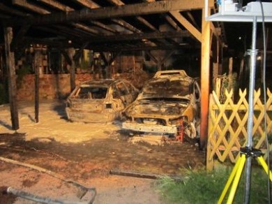 Am 06.06.2013, um 00:37 Uhr wurde hiesige Dienststelle über einen PKW Brand in Bingen Büdesheim, auf dem Parkplatz „Am Langenstein“ informiert. Vor Ort stellte sich heraus, dass zwei nebeneinander geparkte Autos im Motorbereich brannten. Das Feuer konnte durch die alarmierte Feuerwehr Bingen-Büdesheim schnell gelöscht werden. Knapp 15 Minuten später, noch im Laufe der Löscharbeiten, erreichte hiesige Dienststelle die Meldung über Explosionsgeräusche und Rauch in der nahegelegenen Burgstraße. Eine sofortige Nachschau ergab, dass auch hier zwei Fahrzeuge brannten. Diese befanden sich unter einem freistehenden hölzernen Carport. Hier gestalteten sich die Löscharbeiten jedoch aufgrund der Enge der Straße schwierig, so dass diese beiden Fahrzeuge und auch der Carport Opfer der Flammen wurden. Neben der Polizei waren noch rund 30 Feuerwehrleute im Einsatz. Bei dem Einsatz wurde glücklicherweise niemand verletzt. Jedoch entstand ein Sachschaden in Höhe von insgesamt rund 22.000,00 Euro. Es wird ein Tatzusammenhang von beiden Bränden angenommen. Auch kann ein Zusammenhang mit der Brandserie von Mülltonnenbränden oder ähnlichem in der Vergangenheit im Binger Stadtgebiet nicht ausgeschlossen werden.