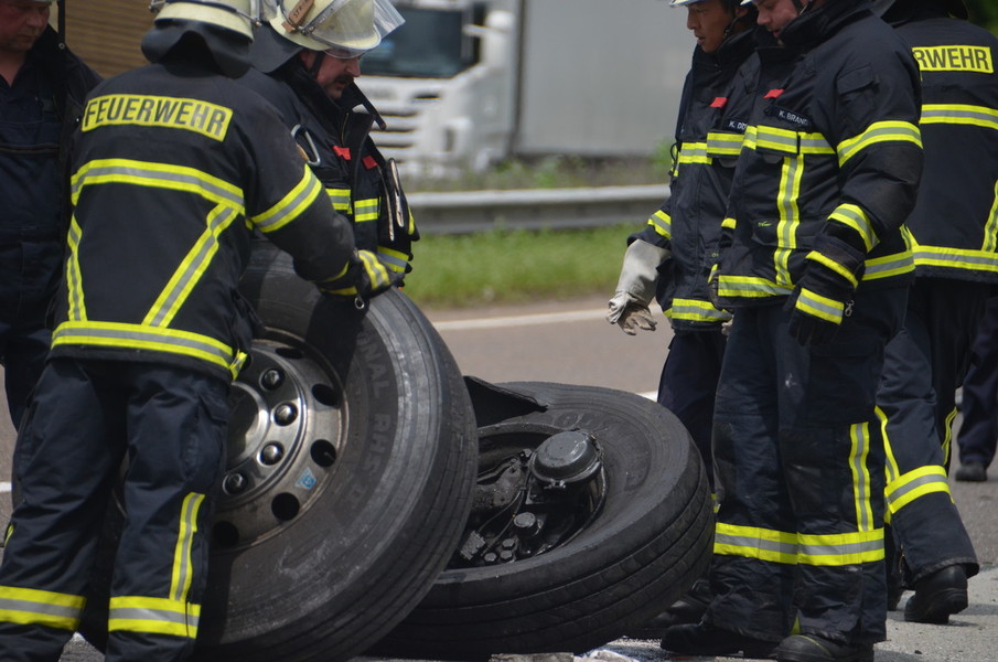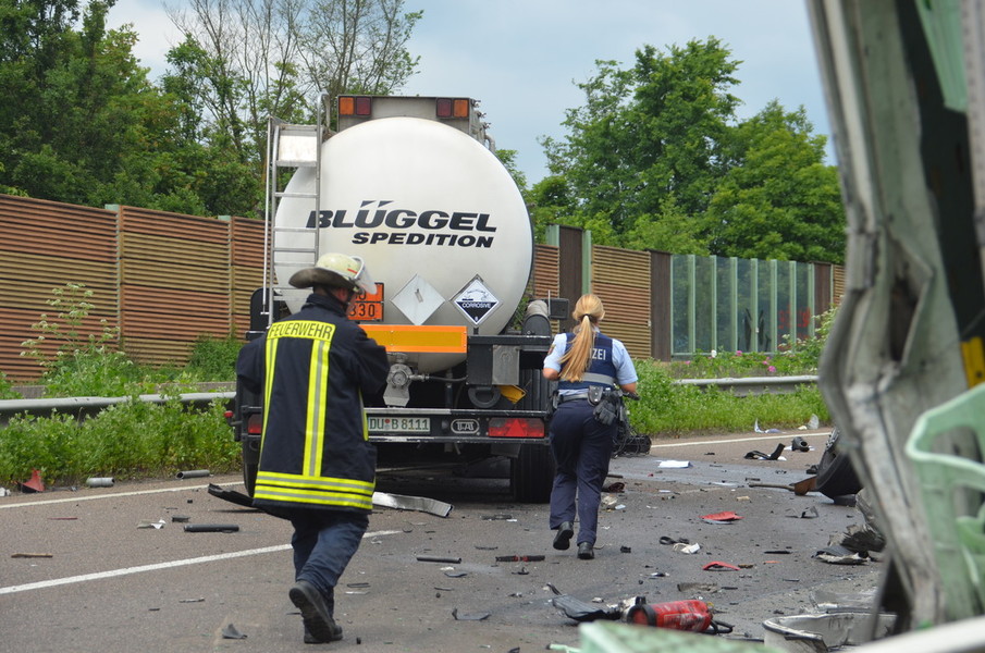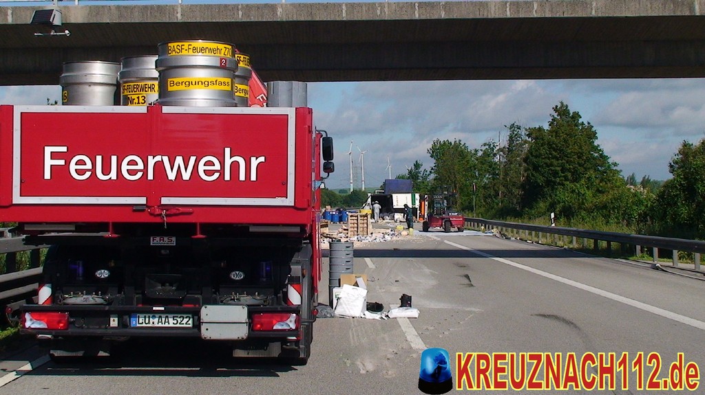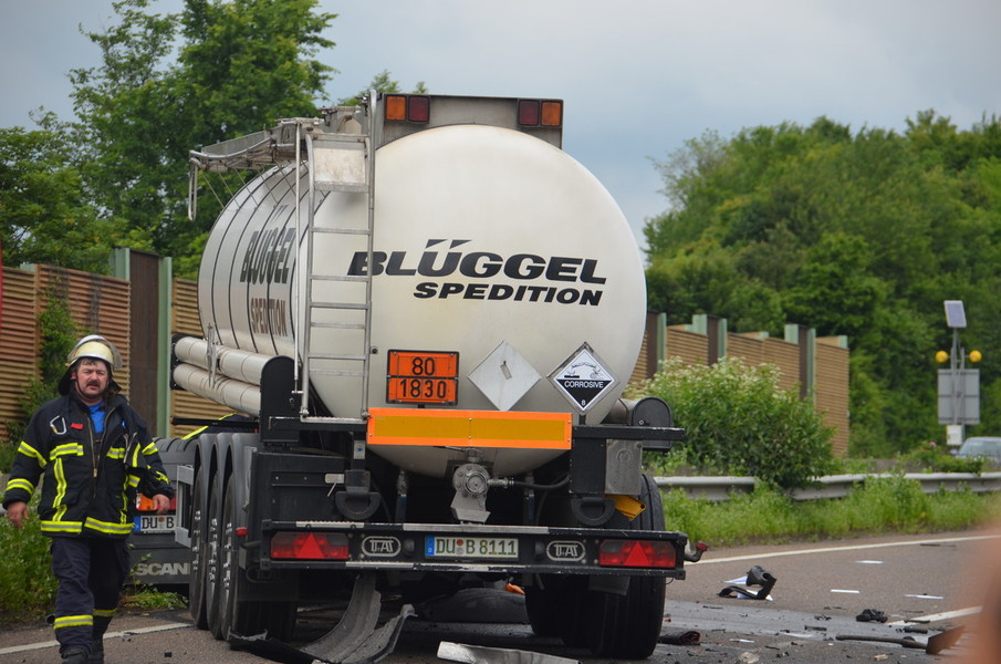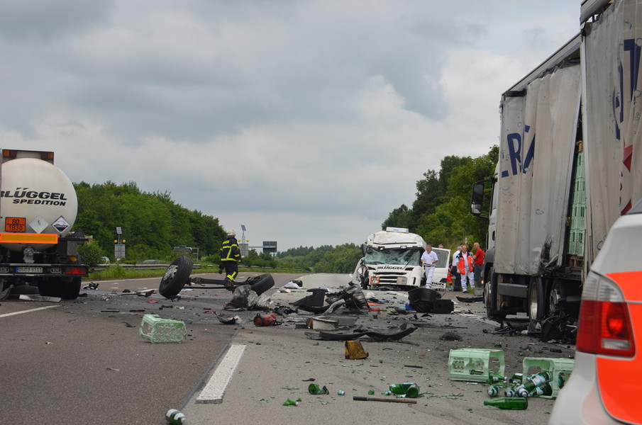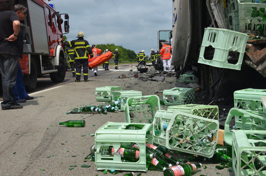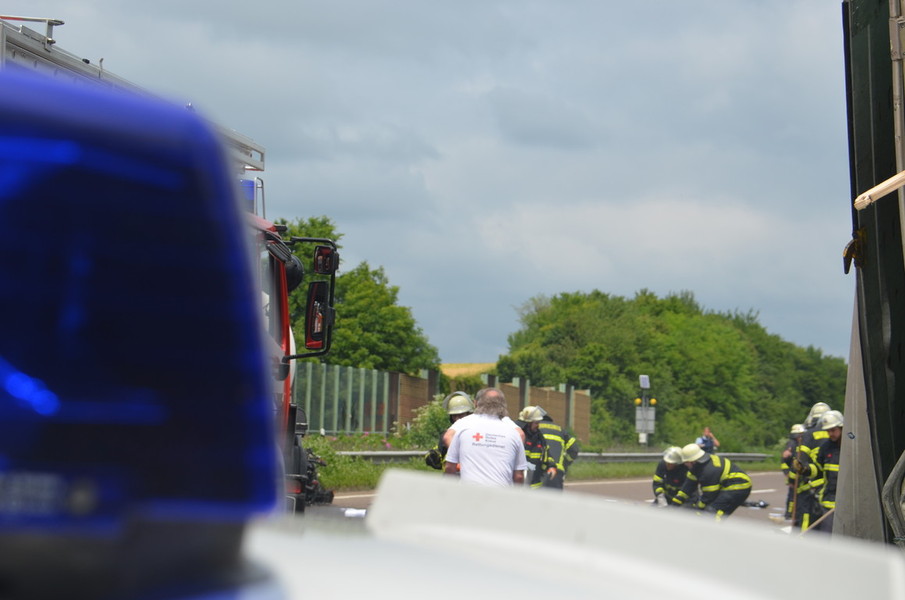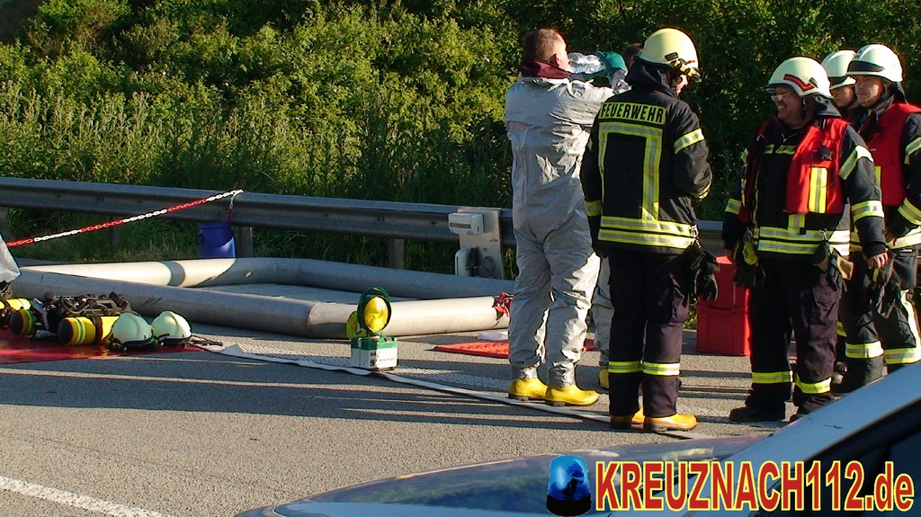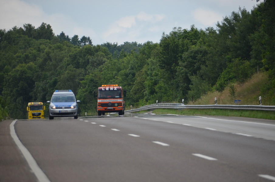 beschädigt, so dass eine geringe Menge eines flüchtigen Stoffes austrat. Die daraus entstehenden Gefahren waren zunächst nicht bekannt, so dass die Autobahn in beide Fahrtrichtungen voll gesperrt
