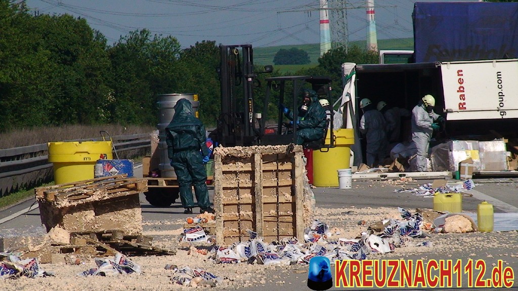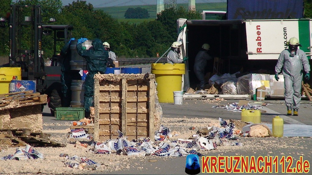 Gesundheitsgefährdung führen können. Viel größere Probleme bereiten zur Zeit zwei Paletten mit Bauschaum. Eine große Anzahl Dosen war beim Aufprall auf die Fahrbahn aufgeplatzt und der Schaum auf der
