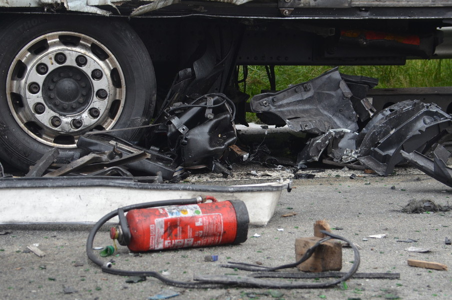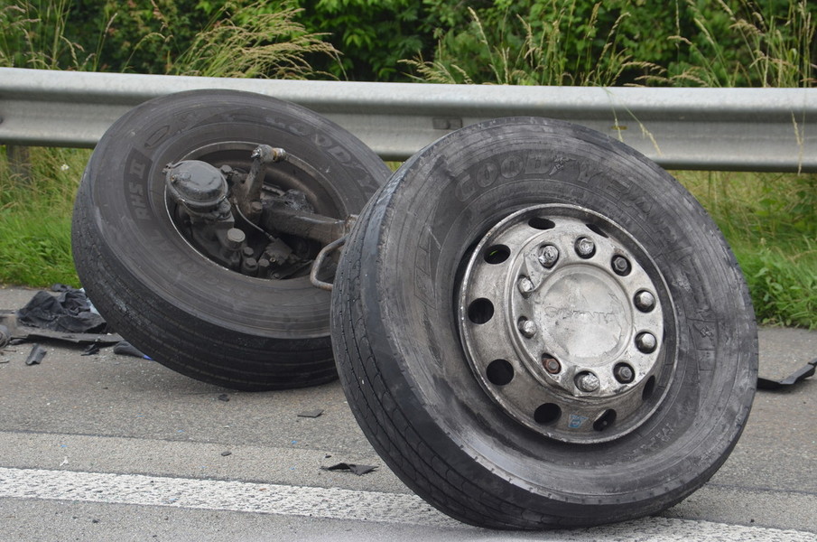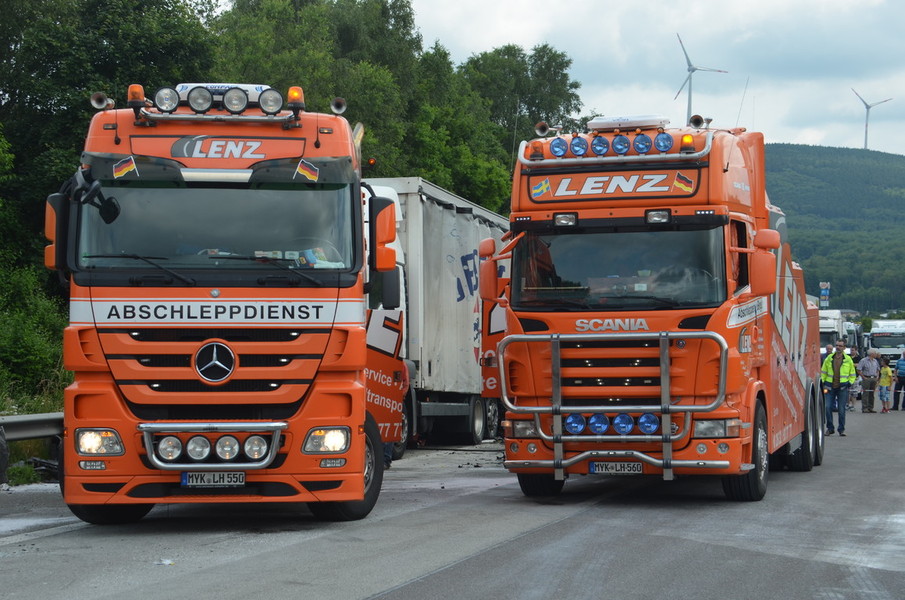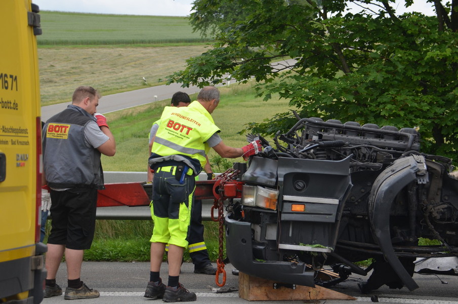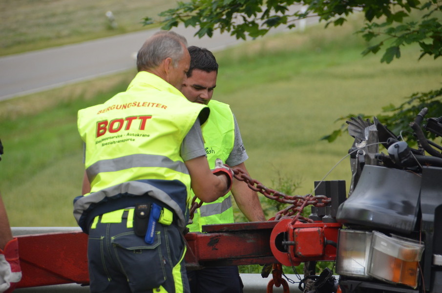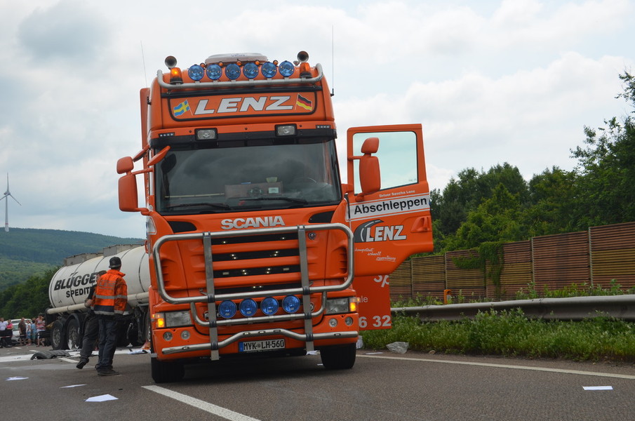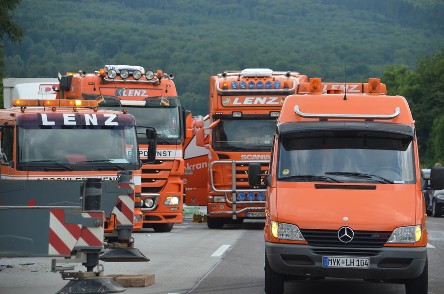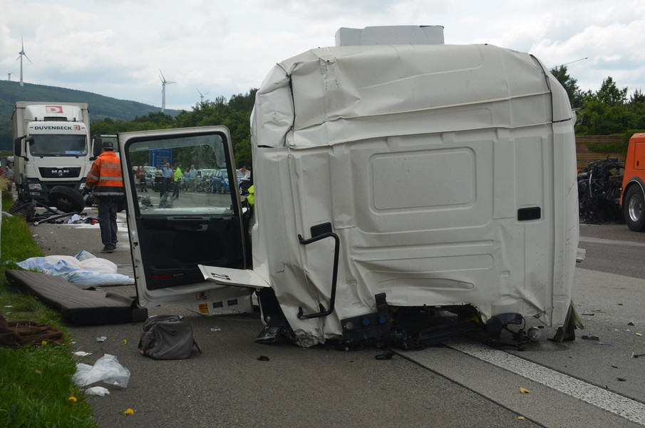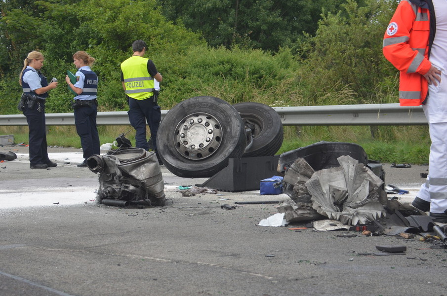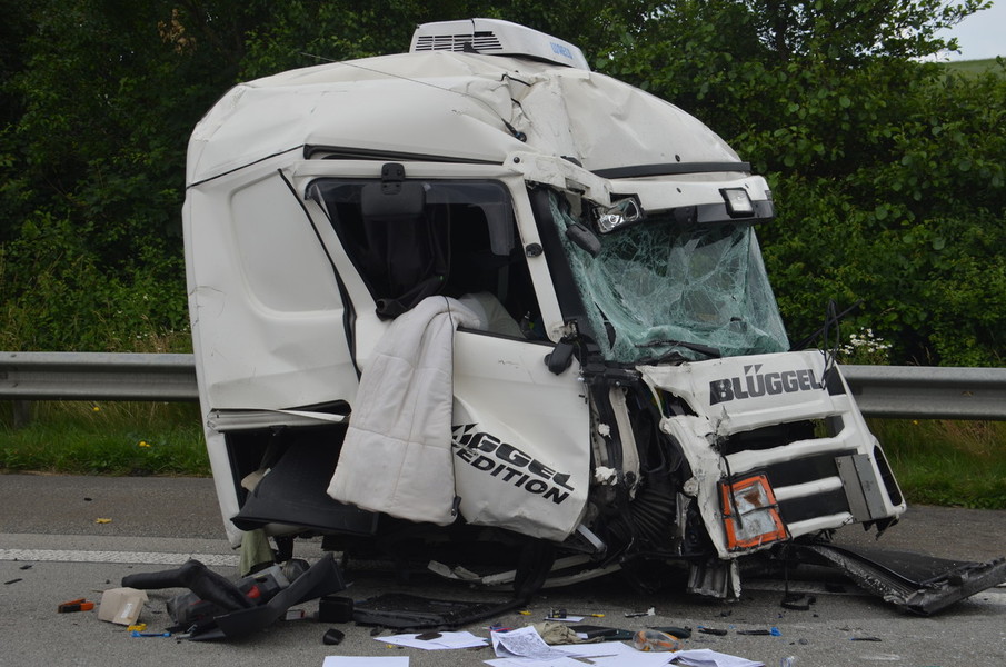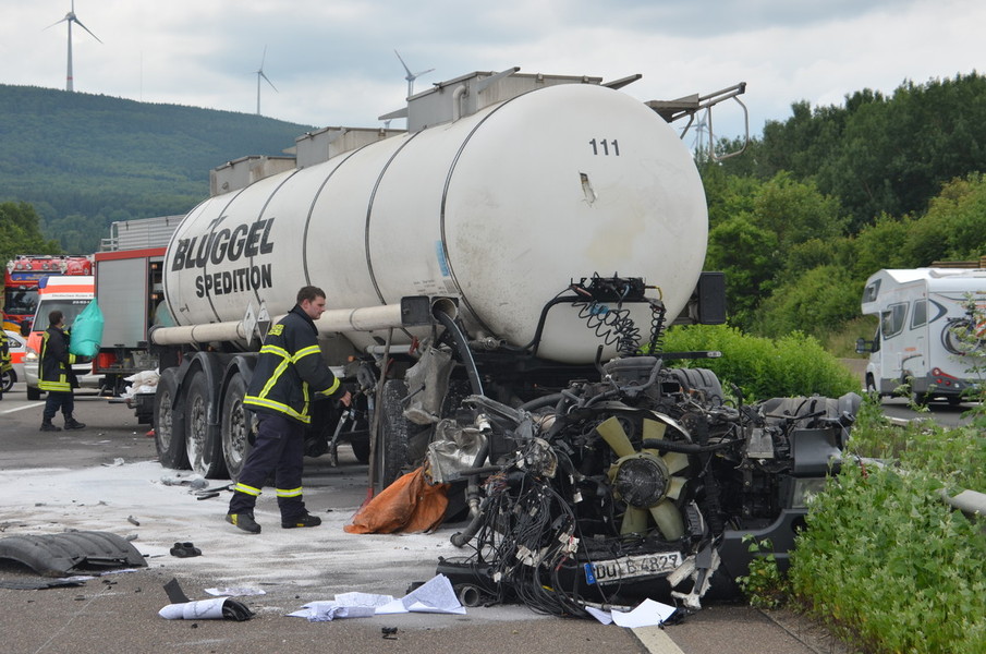 aufstellen wollte ist ein Gefahrgut-Tank LKW auf das Linke Heck aufgefahren. Dadurch wurde die Fahrerkabine abgerissen und ca.20 m über die Fahrbahn geschleudert. Der Fahrer überlebte schwerverletzt