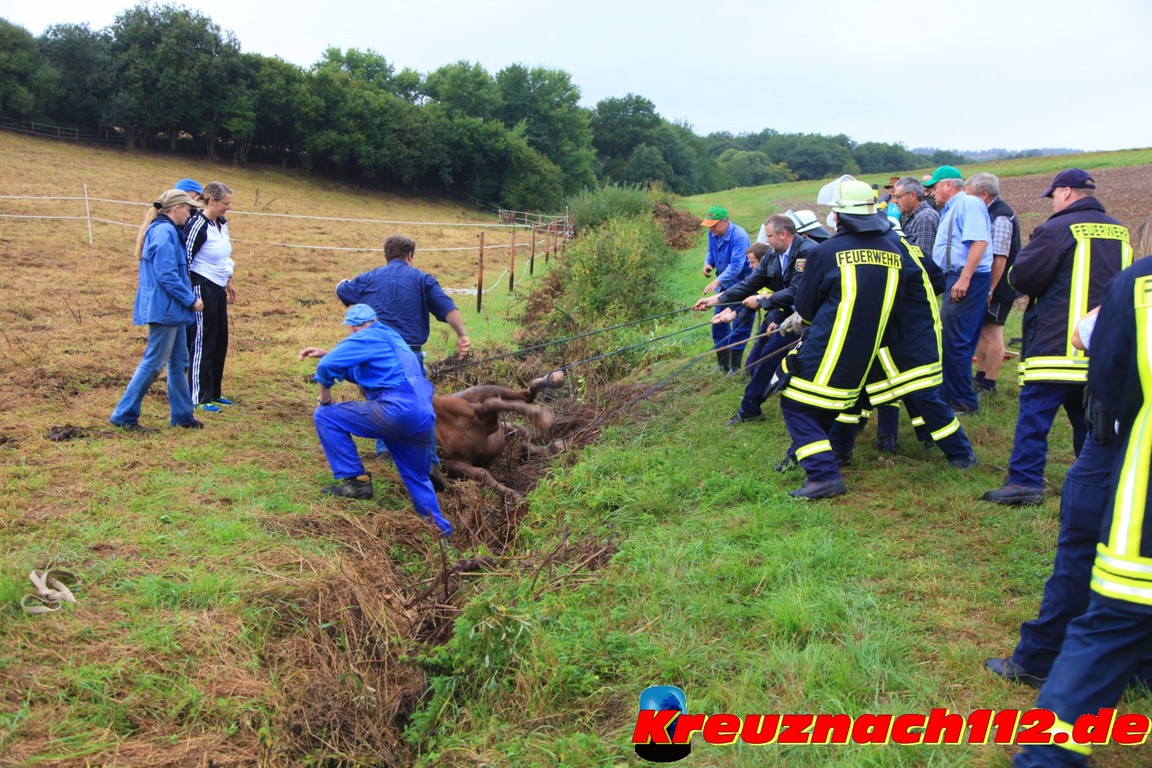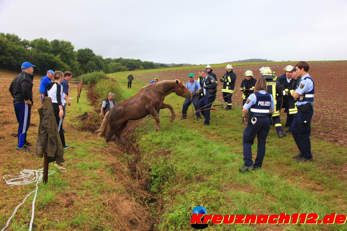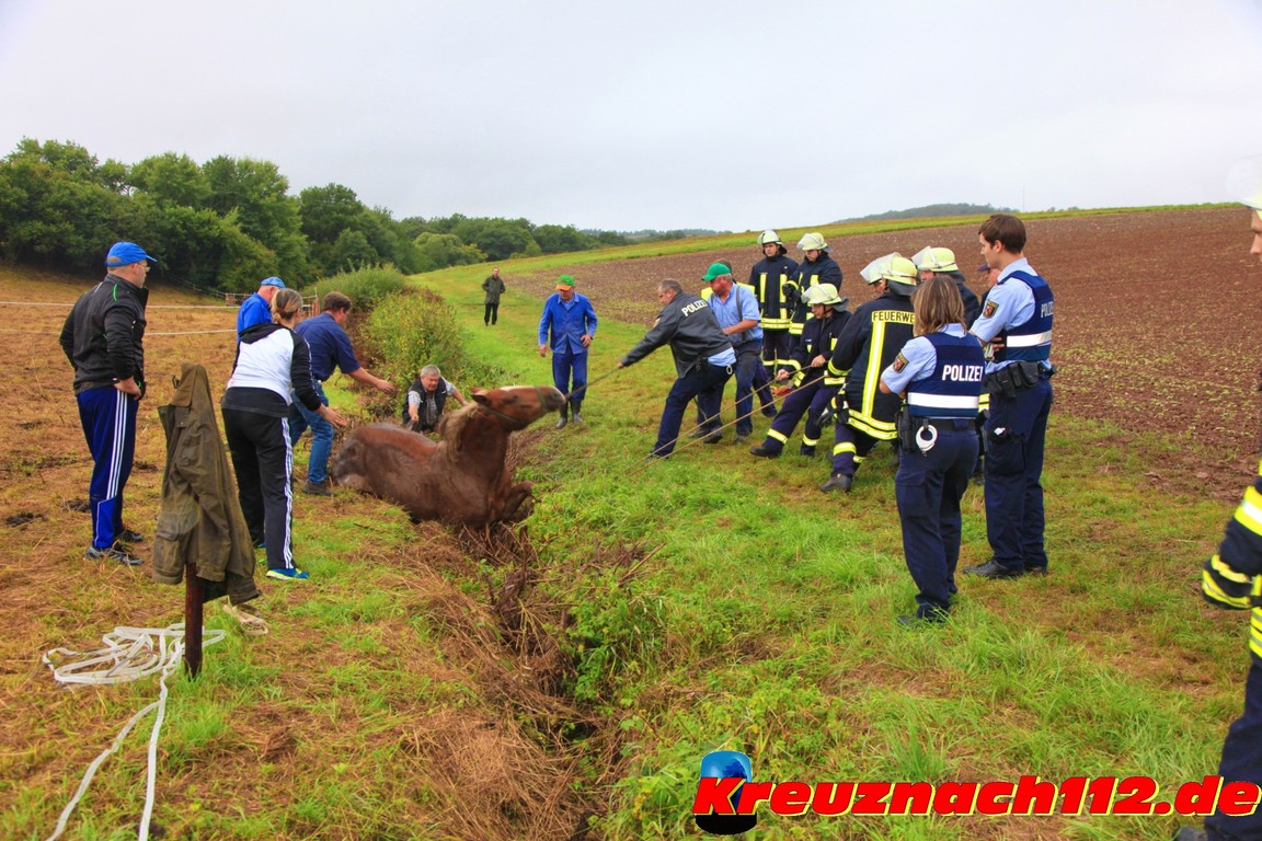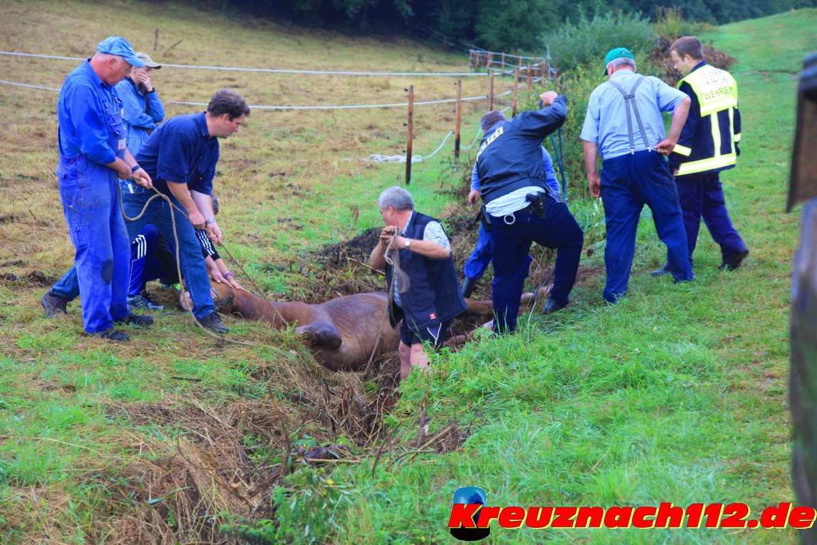 Norman Barth, Wehrleiter der Verbandsgemeinde Kirn-Land, rückte mit seinen 18 Kameraden der Einheiten Becherbach und Limbach zum Einsatzort aus. Mit vereinten Kräften, Seilen, Gurten und Zaumzeug gelang es den zahlreichen Helfern, das zentnerschwere Tier aus seiner misslichen Lage zu befreien. Insgesamt dauerte die Rettungsaktion eine Stunde. Diese hatte den ganzen Ort in Aufruhr versetzt. Viele freiwillige Helfer, die Polizei, der Tierarzt und die Feuerwehr zogen im wahrsten Sinne des Wortes an einem Strang. Reportage Sebastian Schmitt