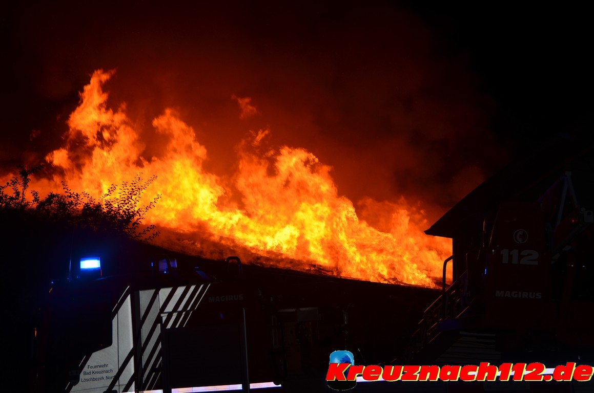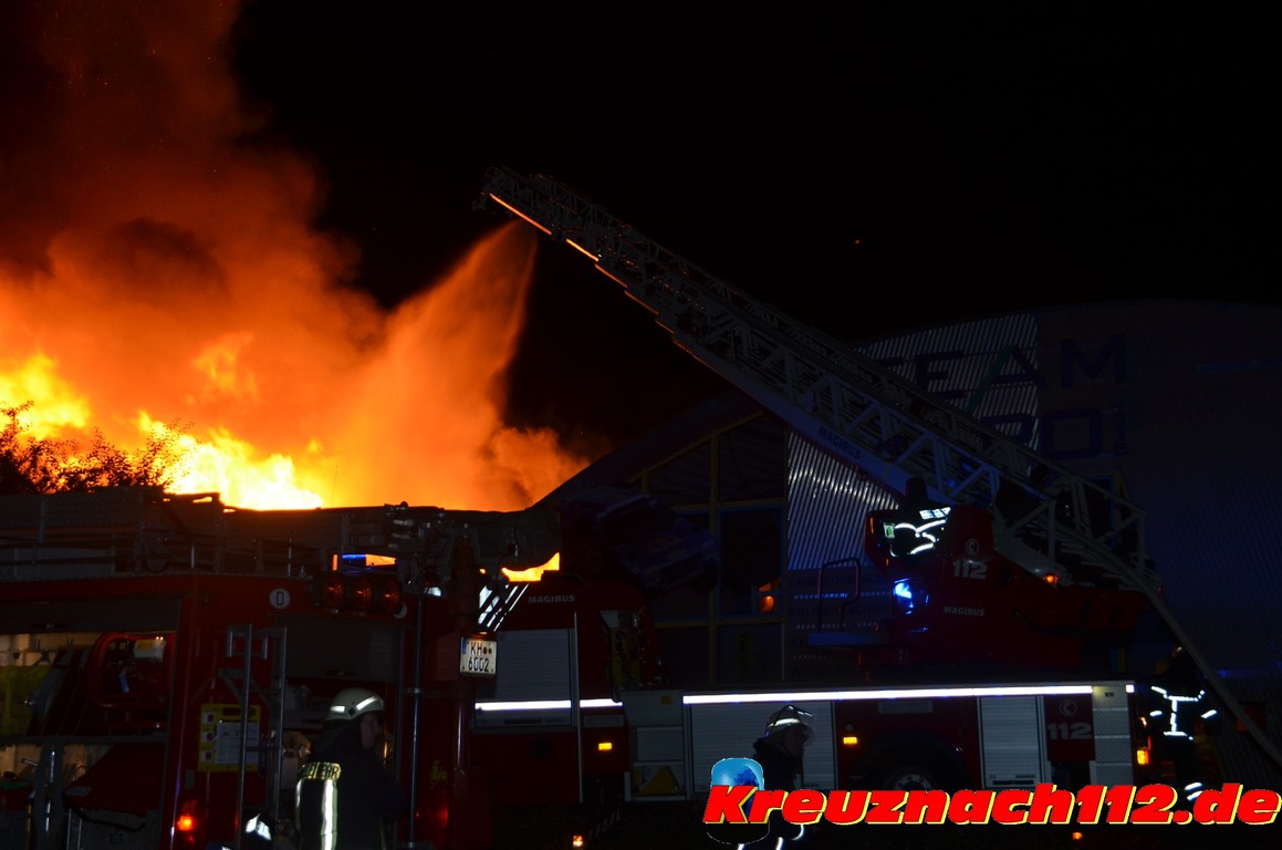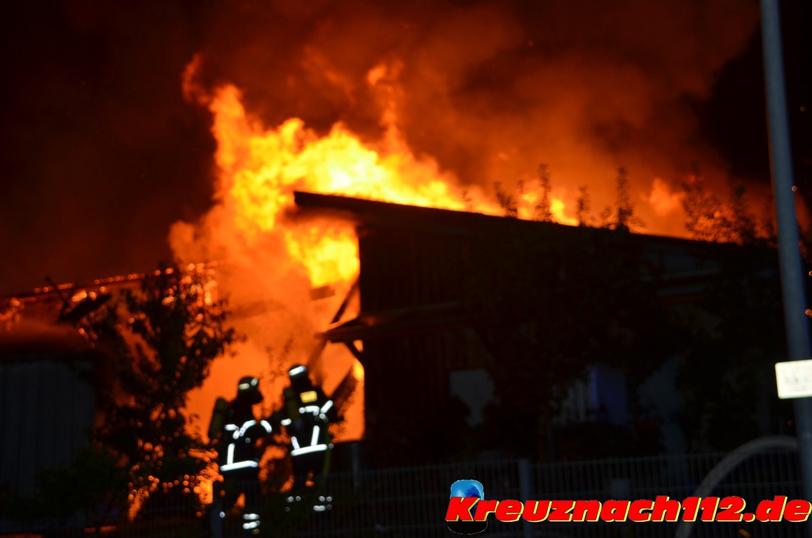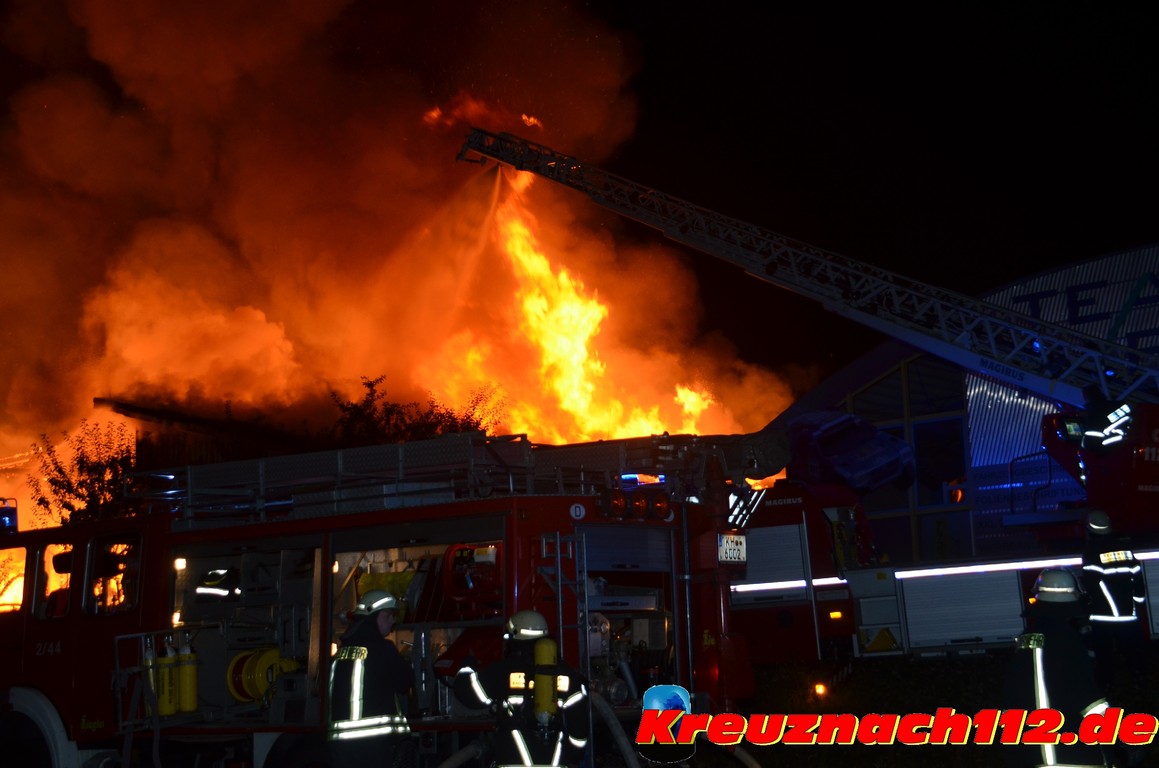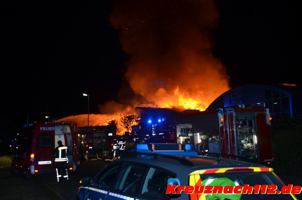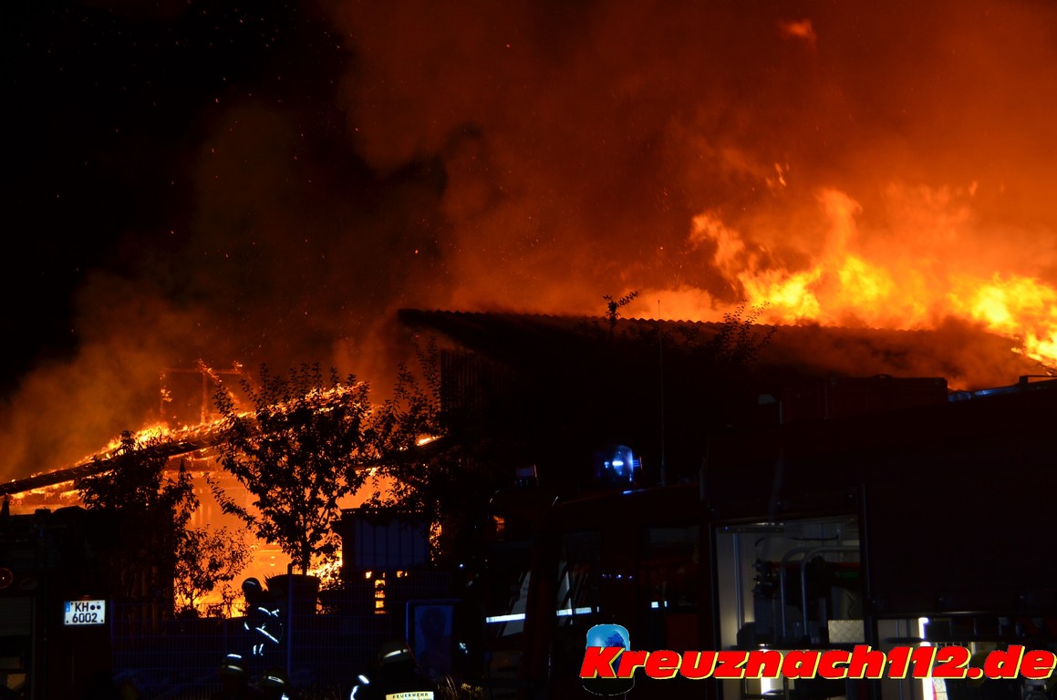 Zu einem Großbrand im Holzbaubetrieb Lehmann in der Bad Kreuznacher Riegelgrube ist es am Freitag um 1.30 Uhr gekommen. Die Kripo schätzt den Schaden auf rund 600.000 Euro.Die ersten eintreffenden Kräfte bauten sofort eine Riegelstellung zu dem auf der rechten Seite stehenden benachbarten Firmengebäude auf. Auf der linken Seite wurde mit einem massiven Löschangriff ein weiteres Ausbreiten auf ein Firmenfahrzeug und im Freien stehende Materialien verhindert. Dabei mussten etwa 30 Gasflaschen gekühlt werden, die bereits voll beflammt wurden. Bei einigen Gasflaschen lösten die Sicherheitsventile aus und ließen das Gas entweichen.Das THW des Ortsverbandes Bad Kreuznach wurde nachalarmiert, um sich um die Entfernung des Daches und das Abtragen des Brandschuttes zu kümmern. Hierfür wurde auch ein Bagger der Firma Gerharz an die Einsatzstelle beordert. Als die Einsatzstelle soweit unter Kontrolle war, konnten die ersten Kräfte aus dem Kreis wieder herausgelöst werden. Während der Anfangsphase stellte die Freiwillige Feuerwehr Rüdesheim mit Ihren Fahrzeugen den Brandschutz in der Stadt sicher. Der Energieversorger stellte den Strom ab. Die Nachlöscharbeiten werden sich noch bis in den Nachmittag hinziehen. Was den Brand auslöste, ist nicht bekannt. Die Kriminalpolizei wird ihre Ermittlungen aufnehmen. Verletzt wurde bei dem Feuer niemand.Das DRK Bad Kreuznach sorgte für die Verpflegung der 123 Einsatzkräfte von Feuerwehr und Technischem Hilfswerk. Die zehn ehrenamtlichen Rotkreuzhelfer stellten an der Einsatzstelle heiße und kalte Getränke sowie eine Kaltverpflegung bereit. Neben der Verpflegungseinheit war auch ein Rettungswagen des DRK Kreisverbandes Bad Kreuznach im Einsatz, der für die medizinische Betreuung der Einsatzkräfte bereit stand.