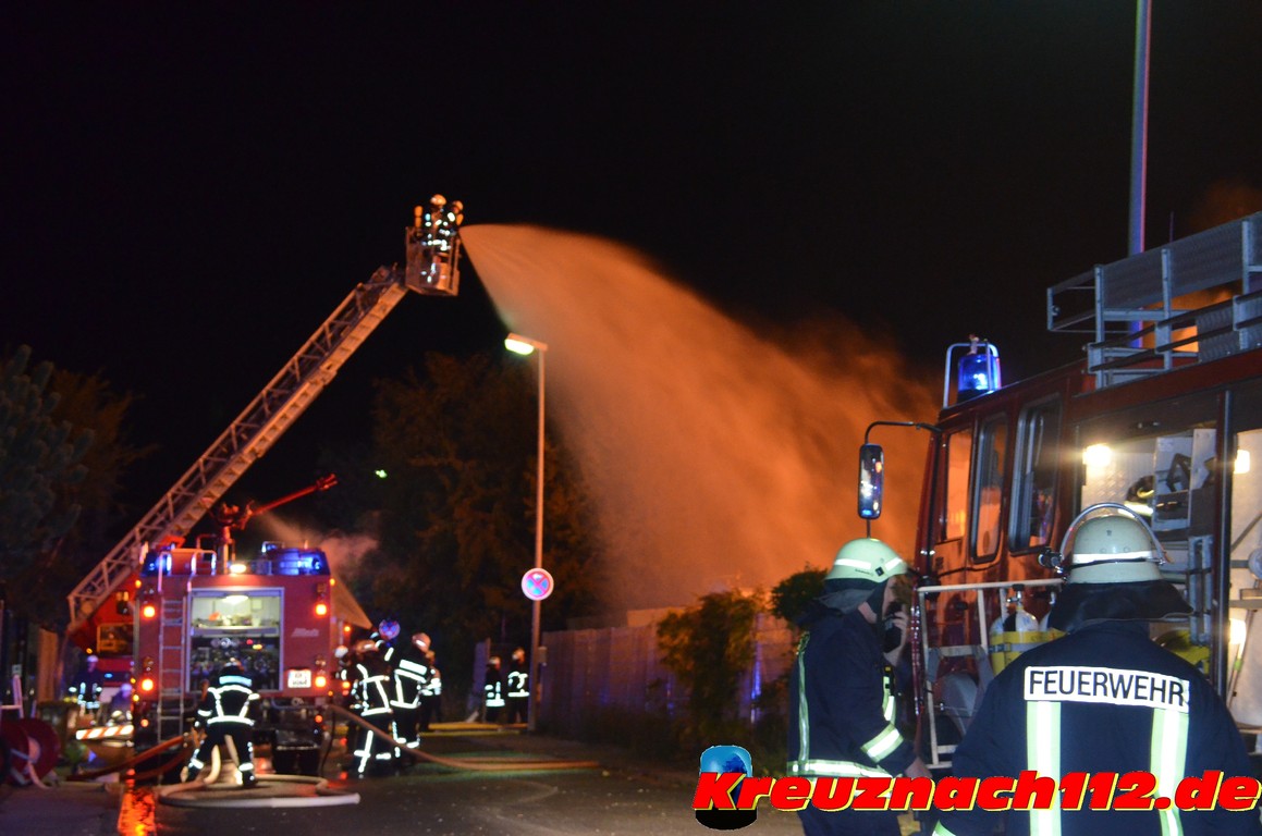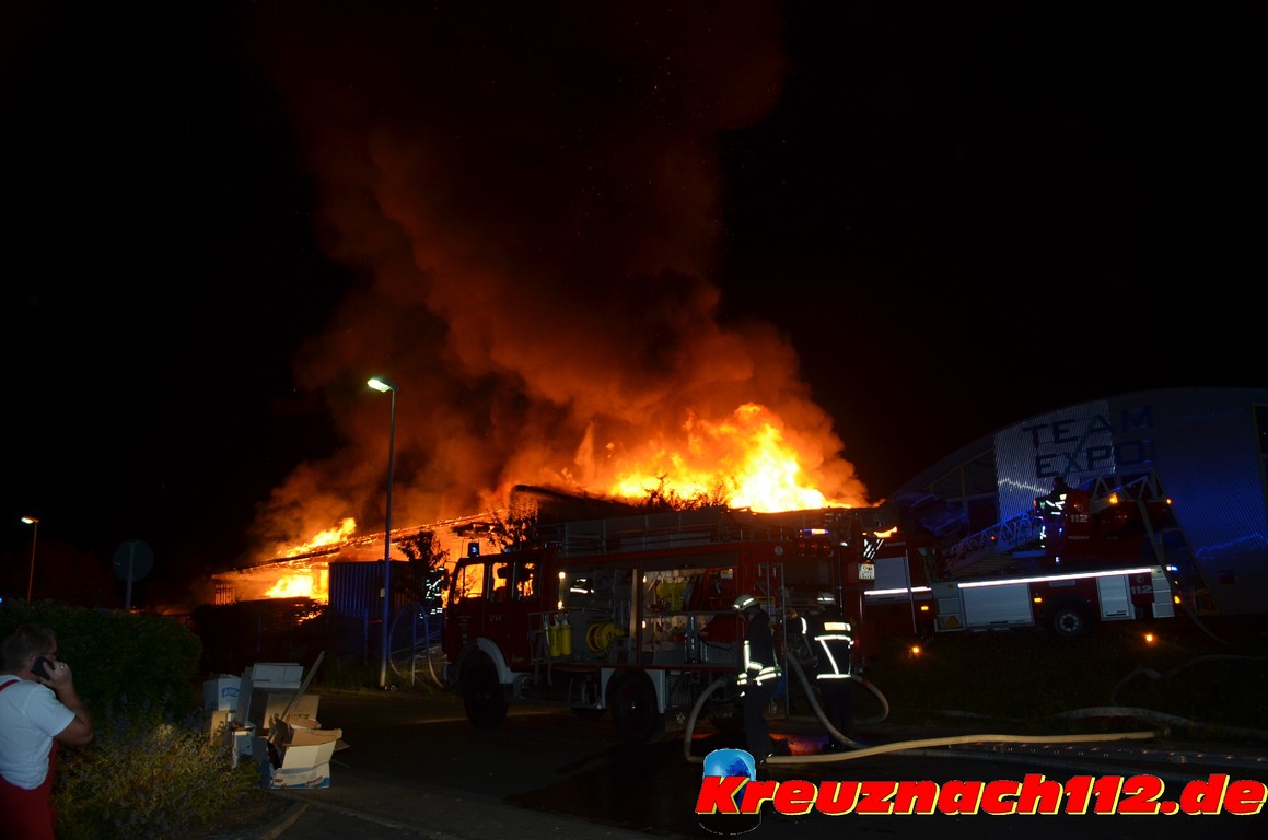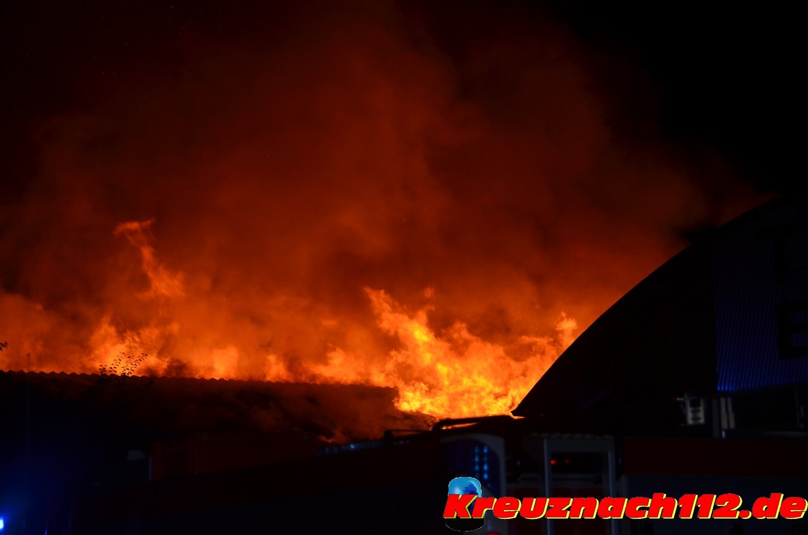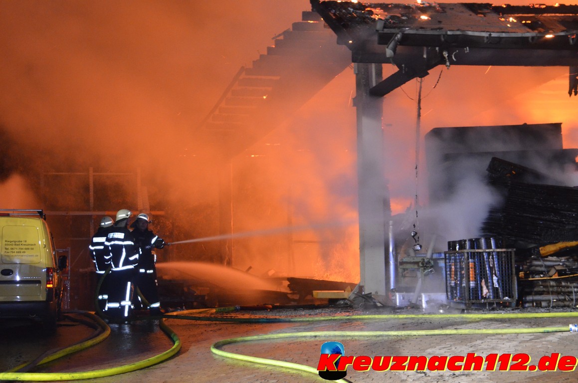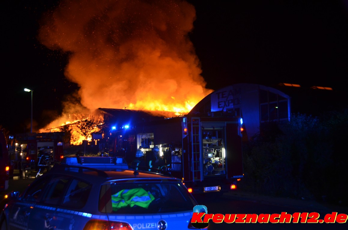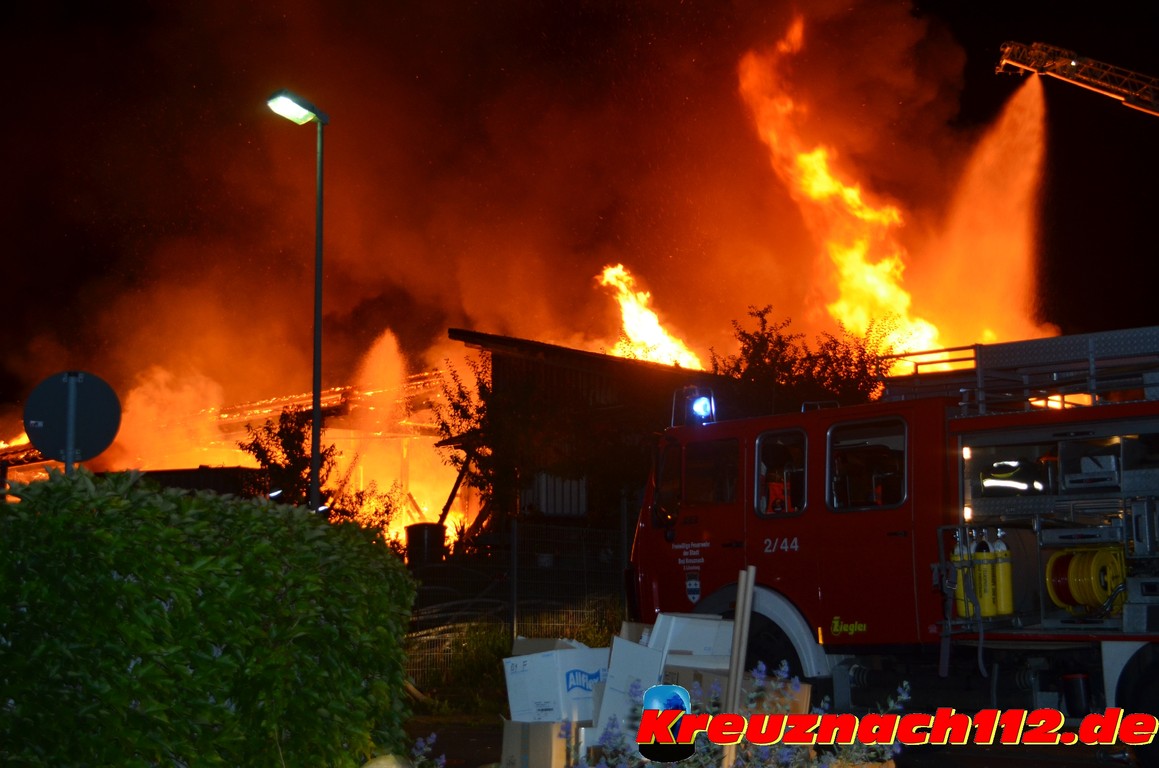 Zu einem Großbrand im Holzbaubetrieb Lehmann in der Bad Kreuznacher Riegelgrube ist es am Freitag um 1.30 Uhr gekommen. Die Kripo schätzt den Schaden auf rund 600.000 Euro.Die ersten eintreffenden Kräfte bauten sofort eine Riegelstellung zu dem auf der rechten Seite stehenden benachbarten Firmengebäude auf. Auf der linken Seite wurde mit einem massiven Löschangriff ein weiteres Ausbreiten auf ein Firmenfahrzeug und im Freien stehende Materialien verhindert. Dabei mussten etwa 30 Gasflaschen gekühlt werden, die bereits voll beflammt wurden. Bei einigen Gasflaschen lösten die Sicherheitsventile aus und ließen das Gas entweichen.Das THW des Ortsverbandes Bad Kreuznach wurde nachalarmiert, um sich um die Entfernung des Daches und das Abtragen des Brandschuttes zu kümmern. Hierfür wurde auch ein Bagger der Firma Gerharz an die Einsatzstelle beordert. Als die Einsatzstelle soweit unter Kontrolle war, konnten die ersten Kräfte aus dem Kreis wieder herausgelöst werden. Während der Anfangsphase stellte die Freiwillige Feuerwehr Rüdesheim mit Ihren Fahrzeugen den Brandschutz in der Stadt sicher. Der Energieversorger stellte den Strom ab. Die Nachlöscharbeiten werden sich noch bis in den Nachmittag hinziehen. Was den Brand auslöste, ist nicht bekannt. Die Kriminalpolizei wird ihre Ermittlungen aufnehmen. Verletzt wurde bei dem Feuer niemand.Das DRK Bad Kreuznach sorgte für die Verpflegung der 123 Einsatzkräfte von Feuerwehr und Technischem Hilfswerk. Die zehn ehrenamtlichen Rotkreuzhelfer stellten an der Einsatzstelle heiße und kalte Getränke sowie eine Kaltverpflegung bereit. Neben der Verpflegungseinheit war auch ein Rettungswagen des DRK Kreisverbandes Bad Kreuznach im Einsatz, der für die medizinische Betreuung der Einsatzkräfte bereit stand.