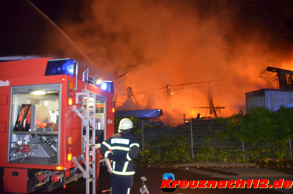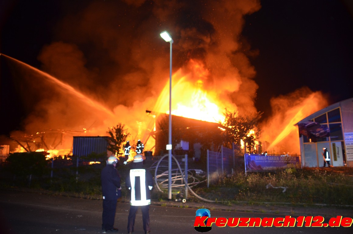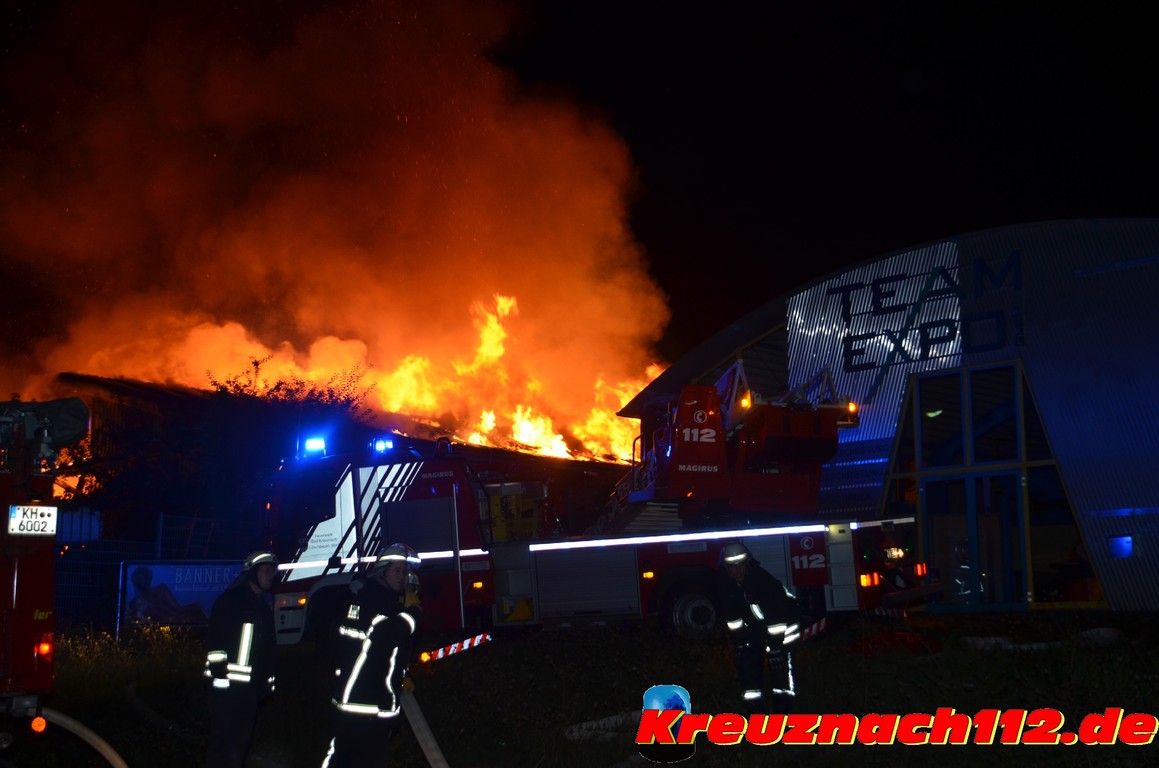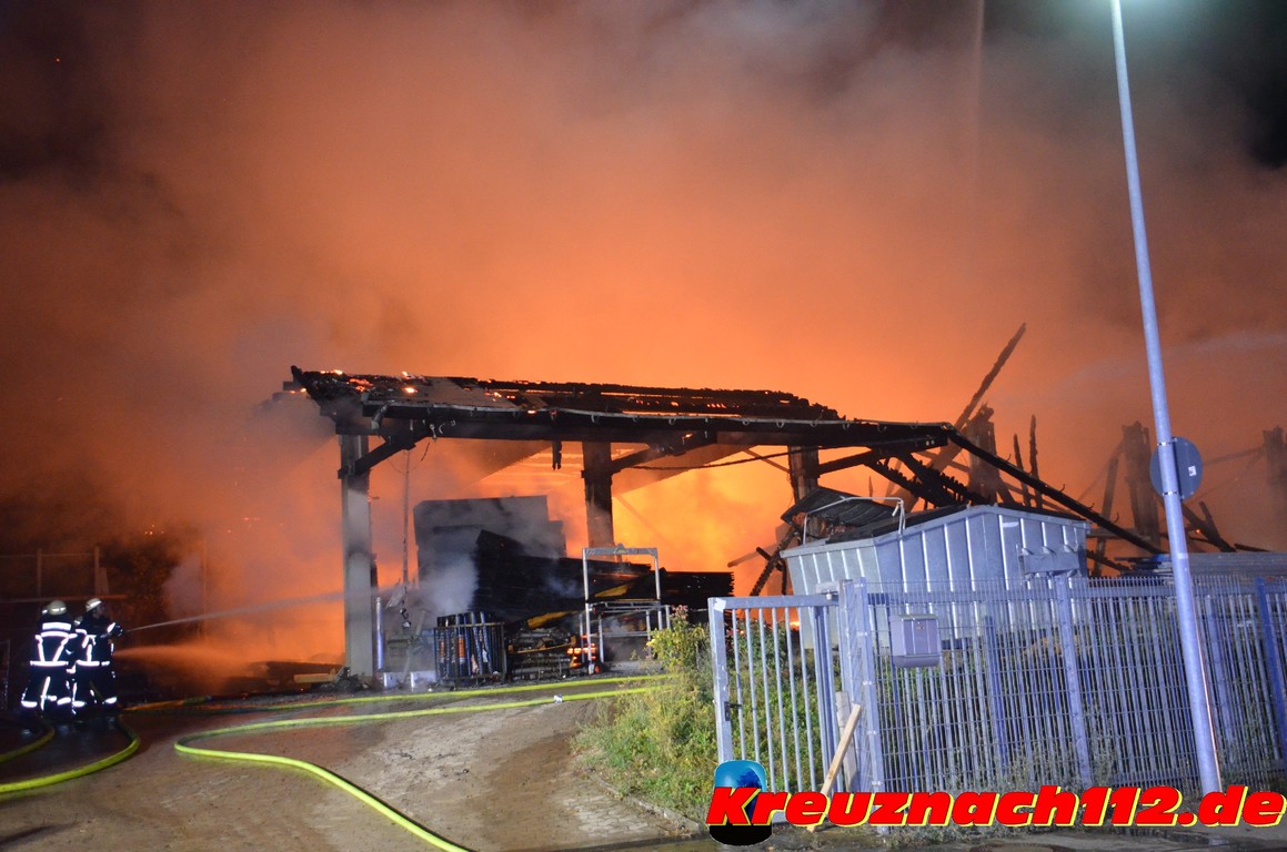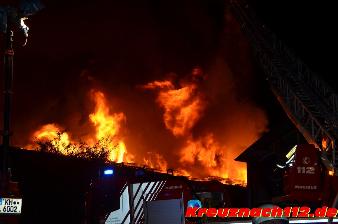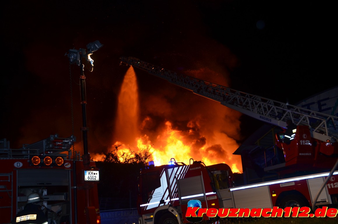 Zu einem Großbrand im Holzbaubetrieb Lehmann in der Bad Kreuznacher Riegelgrube ist es am Freitag um 1.30 Uhr gekommen. Die Kripo schätzt den Schaden auf rund 600.000 Euro.Die ersten eintreffenden Kräfte bauten sofort eine Riegelstellung zu dem auf der rechten Seite stehenden benachbarten Firmengebäude auf. Auf der linken Seite wurde mit einem massiven Löschangriff ein weiteres Ausbreiten auf ein Firmenfahrzeug und im Freien stehende Materialien verhindert. Dabei mussten etwa 30 Gasflaschen gekühlt werden, die bereits voll beflammt wurden. Bei einigen Gasflaschen lösten die Sicherheitsventile aus und ließen das Gas entweichen.Das THW des Ortsverbandes Bad Kreuznach wurde nachalarmiert, um sich um die Entfernung des Daches und das Abtragen des Brandschuttes zu kümmern. Hierfür wurde auch ein Bagger der Firma Gerharz an die Einsatzstelle beordert. Als die Einsatzstelle soweit unter Kontrolle war, konnten die ersten Kräfte aus dem Kreis wieder herausgelöst werden. Während der Anfangsphase stellte die Freiwillige Feuerwehr Rüdesheim mit Ihren Fahrzeugen den Brandschutz in der Stadt sicher. Der Energieversorger stellte den Strom ab. Die Nachlöscharbeiten werden sich noch bis in den Nachmittag hinziehen. Was den Brand auslöste, ist nicht bekannt. Die Kriminalpolizei wird ihre Ermittlungen aufnehmen. Verletzt wurde bei dem Feuer niemand.Das DRK Bad Kreuznach sorgte für die Verpflegung der 123 Einsatzkräfte von Feuerwehr und Technischem Hilfswerk. Die zehn ehrenamtlichen Rotkreuzhelfer stellten an der Einsatzstelle heiße und kalte Getränke sowie eine Kaltverpflegung bereit. Neben der Verpflegungseinheit war auch ein Rettungswagen des DRK Kreisverbandes Bad Kreuznach im Einsatz, der für die medizinische Betreuung der Einsatzkräfte bereit stand.
