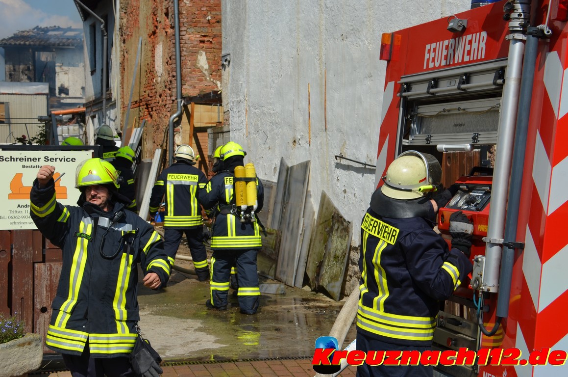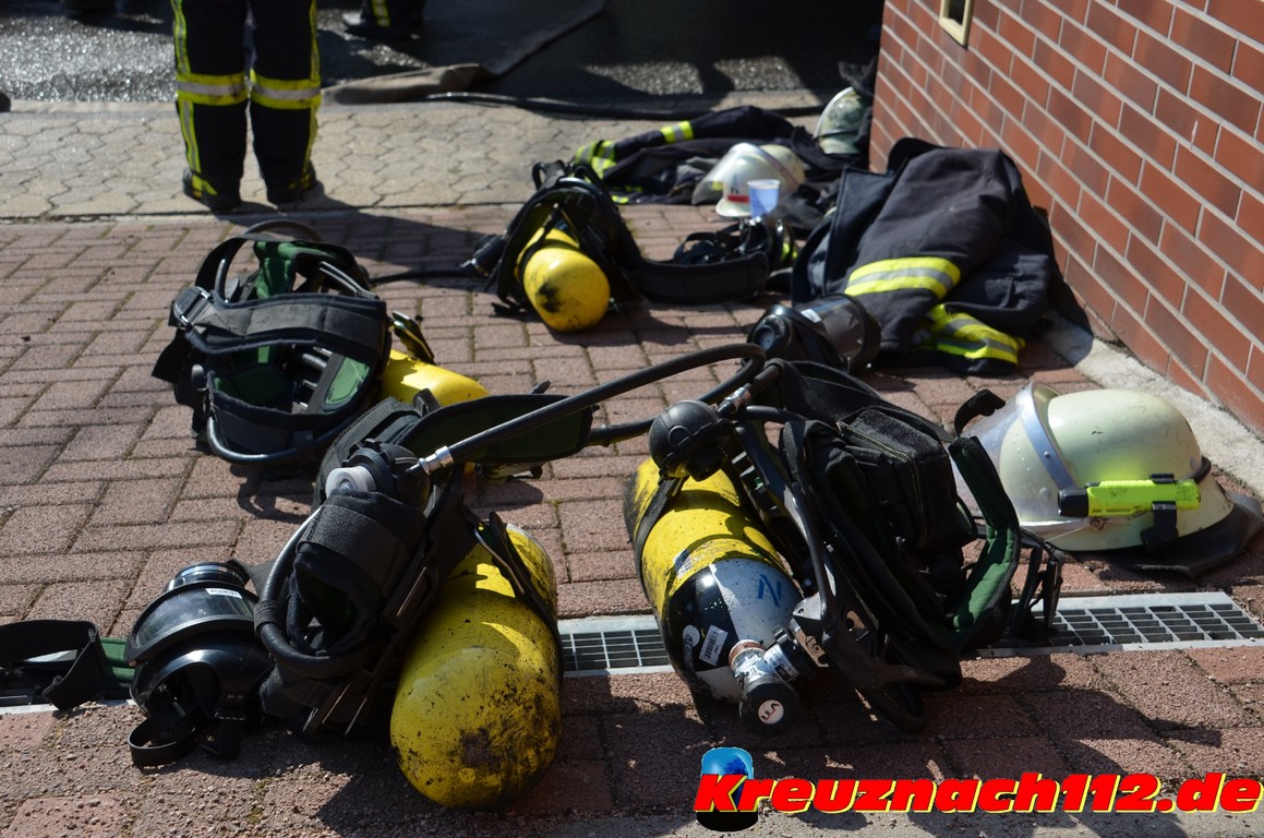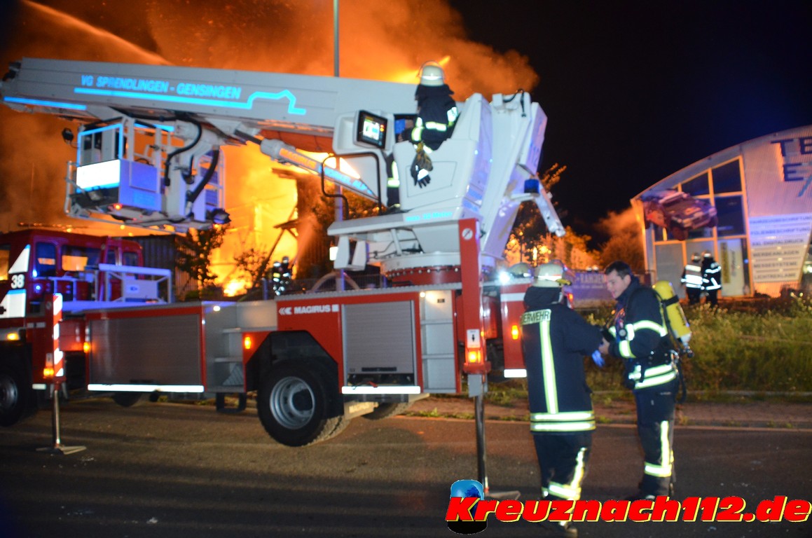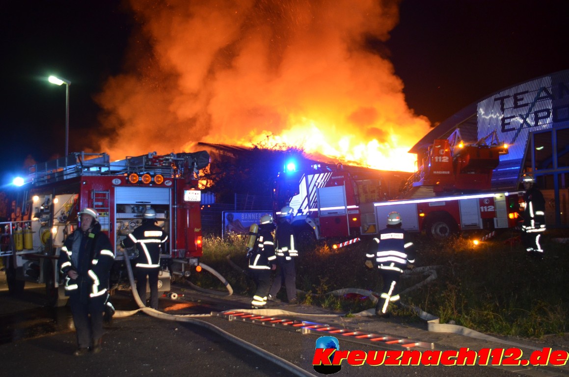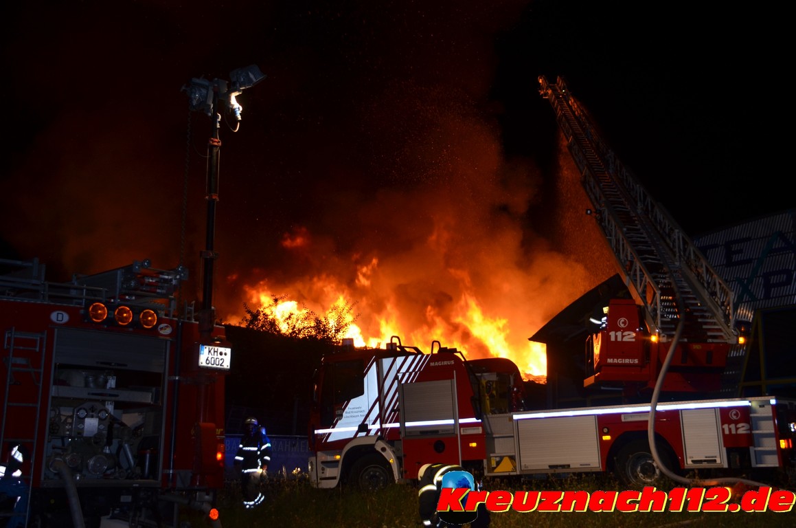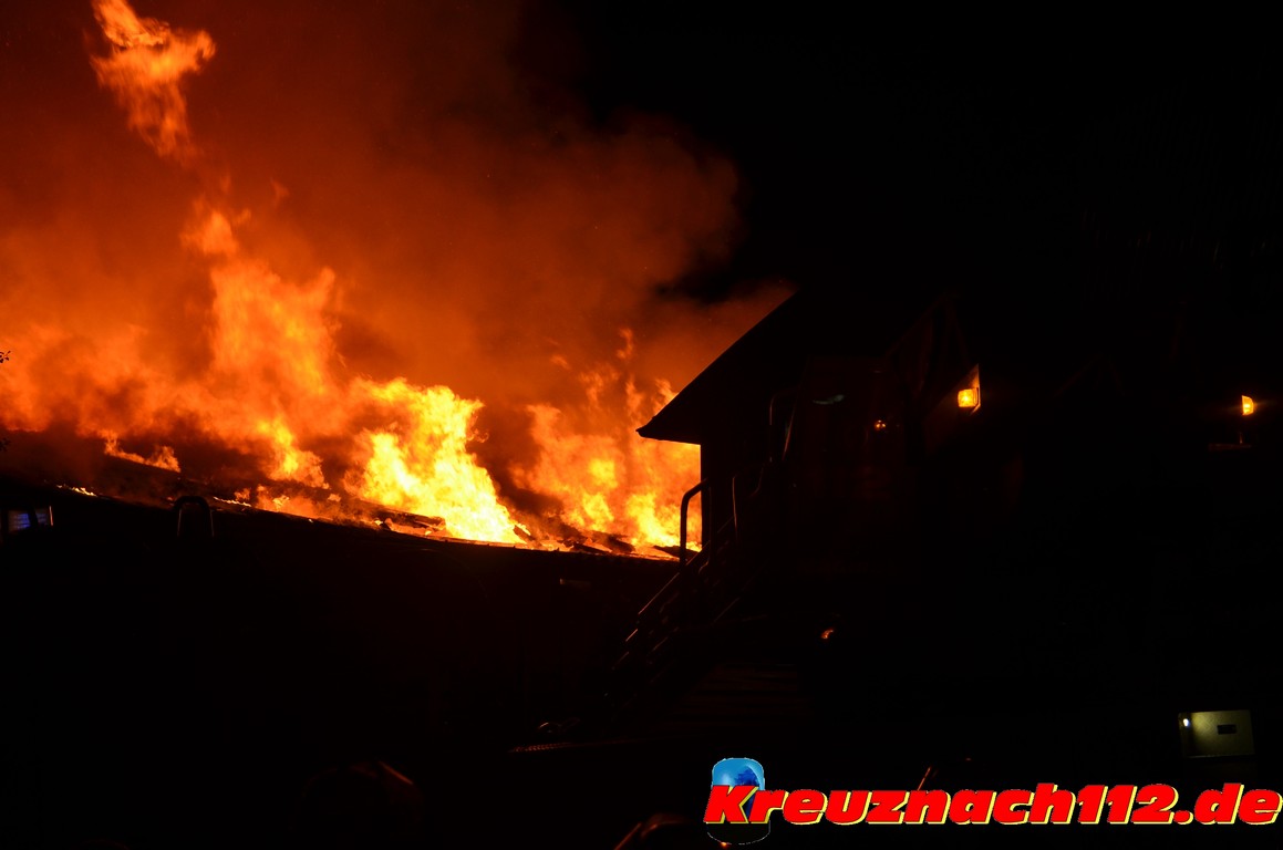 Zu einem Großbrand im Holzbaubetrieb Lehmann in der Bad Kreuznacher Riegelgrube ist es am Freitag um 1.30 Uhr gekommen. Die Kripo schätzt den Schaden auf rund 600.000 Euro.Die ersten eintreffenden Kräfte bauten sofort eine Riegelstellung zu dem auf der rechten Seite stehenden benachbarten Firmengebäude auf. Auf der linken Seite wurde mit einem massiven Löschangriff ein weiteres Ausbreiten auf ein Firmenfahrzeug und im Freien stehende Materialien verhindert. Dabei mussten etwa 30 Gasflaschen gekühlt werden, die bereits voll beflammt wurden. Bei einigen Gasflaschen lösten die Sicherheitsventile aus und ließen das Gas entweichen.Das THW des Ortsverbandes Bad Kreuznach wurde nachalarmiert, um sich um die Entfernung des Daches und das Abtragen des Brandschuttes zu kümmern. Hierfür wurde auch ein Bagger der Firma Gerharz an die Einsatzstelle beordert. Als die Einsatzstelle soweit unter Kontrolle war, konnten die ersten Kräfte aus dem Kreis wieder herausgelöst werden. Während der Anfangsphase stellte die Freiwillige Feuerwehr Rüdesheim mit Ihren Fahrzeugen den Brandschutz in der Stadt sicher. Der Energieversorger stellte den Strom ab. Die Nachlöscharbeiten werden sich noch bis in den Nachmittag hinziehen. Was den Brand auslöste, ist nicht bekannt. Die Kriminalpolizei wird ihre Ermittlungen aufnehmen. Verletzt wurde bei dem Feuer niemand.Das DRK Bad Kreuznach sorgte für die Verpflegung der 123 Einsatzkräfte von Feuerwehr und Technischem Hilfswerk. Die zehn ehrenamtlichen Rotkreuzhelfer stellten an der Einsatzstelle heiße und kalte Getränke sowie eine Kaltverpflegung bereit. Neben der Verpflegungseinheit war auch ein Rettungswagen des DRK Kreisverbandes Bad Kreuznach im Einsatz, der für die medizinische Betreuung der Einsatzkräfte bereit stand.