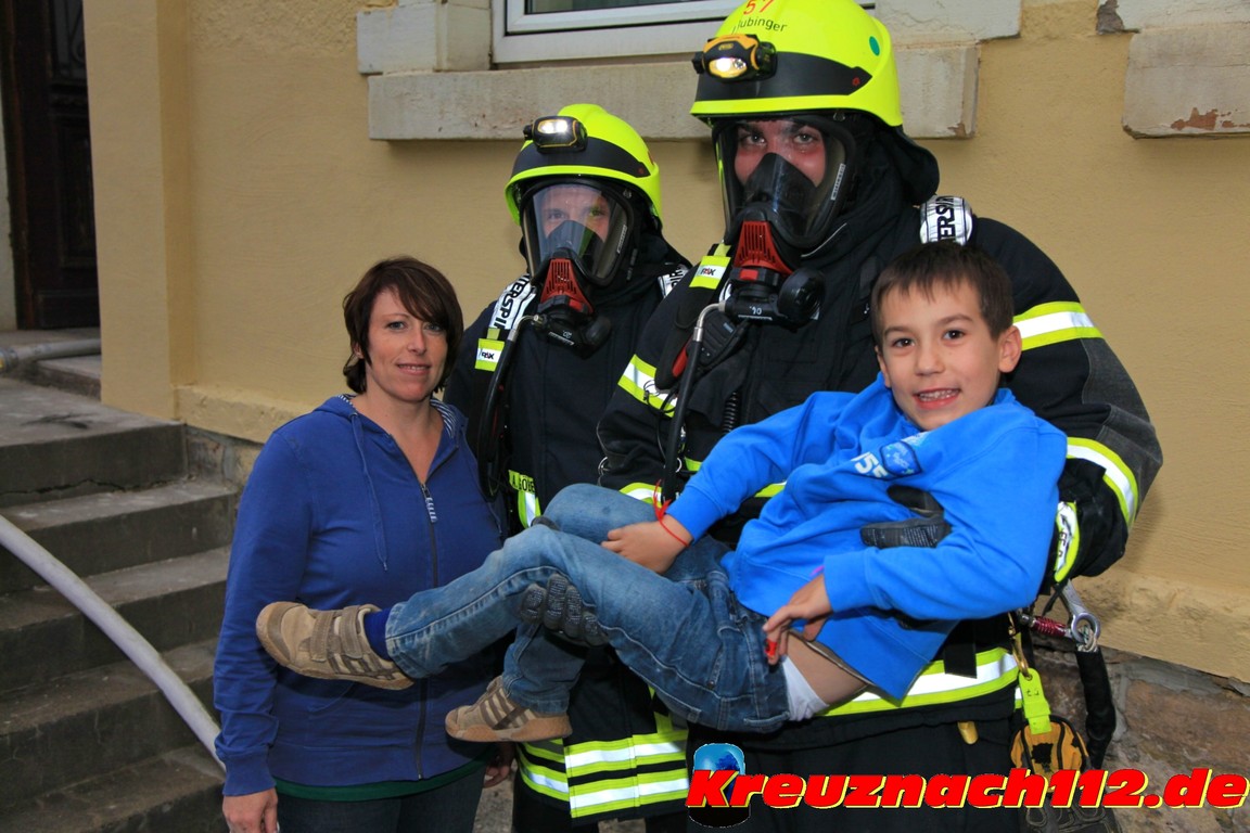 Aufgeregt sitzt der kleine Nilo Kaiser (6) in den 2 Obergeschossen und wartet mit seiner Mama Annette ungeduldig. Sie spielt mit ihrem Sprössling 2 der insgesamt 4 vermissten Personen in dem Bürgerhaus Kallenfels, bei der Monatsübung der Feuerwehr Kirn. Gleich geht es los, es kommen die ersten Fahrzeuge mit Blaulicht, dann stoppt das große Auto und alle steigen aus. Das Herz von Nilo schlägt immer schneller, das merkt Mama Annette ganz deutlich. Im Schimmer der Blaulichter schaut er zu, wie die Feuerwehrmänner und Frauen ihre Atemschutzmasken anlegen. Einer der Männer greift nach dem Funkgerät und lächelt Nilo dabei an. Nilo darf jetzt endlich laut aus dem Fenster um Hilfe rufen. Es ist Montagabend, 19 Uhr, und es wird angenommen, dass sich im Bürgerhaus 4 Personen aufhalten, während im Keller durch einen technischen Defekt ein Feuer ausbricht. Die Feuerwehrleute beginnen mit ihrer Arbeit. Einsatzleiter Markus Spät findet bei seiner Erkundung 1 Person im Erdgeschoss. Die gefundene Person, der Hausmeister der über den Notruf die Feuerwehr verständigte. Er wird nach draußen gebracht, der erste Trupp begibt sich unter Atemschutz in den Keller. Der Eulenweg ist jetzt gesperrt und die nachgerückten Kräfte bauen eine Wasserversorgung auf. Die Übung läuft gut, doch dann auf einmal der Funkspruch: "Mayday - Kamerad verunglückt". Alle schauen sich etwas aufgeregt an, denn keiner weiß so genau, ob dies ernst ist oder zu Übung gehört. Schon ist ein weiterer Atemschutztrupp, der zur Sicherheit bereitstand, auf dem Weg in den Keller. Nach kurzem Warten kommen die zwei Trupps wieder nach oben, tragen ihren Kameraden nach draußen und legen ihn auf einer Decke ab. Dann die Erleichterung: Es war Teil der Übung. Doch keiner wusste von der Einlage. "Der Atemschutznotfall sollte einen Hauptteil der Übung darstellen und wurde daher sehr realistisch eingespielt, damit wir einen optimalen Übungseffekt erzielen", erklärt Führungsassistent Andreas Kaiser. Auch die Mutter von Nilo, die schon öfter bei einer Feuerwehrübung mitgemacht hat, hat die Rettungsaktion beobachtet. "Ich wusste bei unserer Rettung, dass es nur eine Übung ist, und ich war recht gelassen, als ich mit meinem Kind nach draußen gebracht wurden. Es ging alles recht schnell und hier am Versorgungsplatz wurden wir gleich nach unserem Wohlbefinden gefragt." Zum Abschluss gab es noch einen Rundgang mit Ortsvorsteher Erich Haag. Hierbei wurde auch der Teil des Bürgerhaus begutachtet, in dem nicht geübt wurde, um auch hier im Ernstfall einen guten Überblick zu haben. Andy Kaiser berichtet: „Das es vor Jahren im Bürgerhaus zu einem Brand der Elektroheizung gekommen sei, diese aber jetzt durch einen Gasofen ersetzt wurde.“
