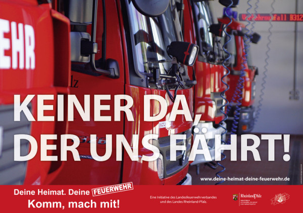 Der Präsident: „Die Kampagne ist auch ein Dankeschön für alle Feuerwehrkameradinnen und Feuerwehrkameraden in Rheinland-Pfalz, die durch ihren im Wesentlichen ehrenamtlichen persönlichen Einsatz täglich 24 Stunden dazu beitragen, dass Sicherheit und Hilfe bei Bränden und Notlagen im schönsten Bundesland der Welt noch immer flächendeckend gewährleistet sind.“ Neben Plakaten, Flyern, Bauzaun-Transparenten und einer speziellen Internet-Homepage werden im Rahmen der Kampagne auch Anzeigenmotive für die örtlichen Medien engagierte Menschen auf den ehrenamtlichen Feuerwehrdienst aufmerksam machen. Auch ist vorgesehen, dass die Einsatzfahrzeuge der Feuerwehren mittels Klebefolien als „rollende Botschafter“ genutzt werden können.