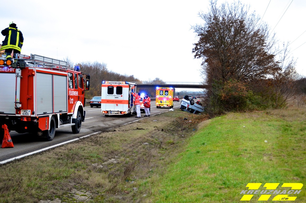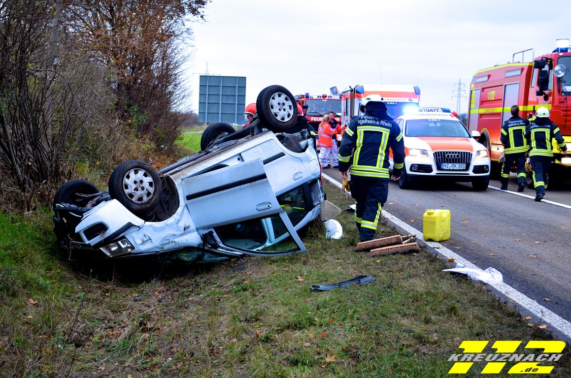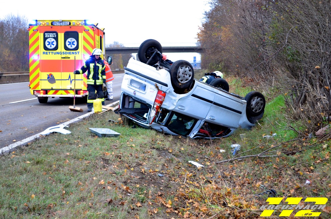 Ingelheim hinzu gerufen. Der Feuerwehr gelang es den Fiat durch Muskelkraft wieder auf die Räder zu stellen. Während der Bergung mussten zwei der drei Spuren gesperrt werden, so dass es zu einem