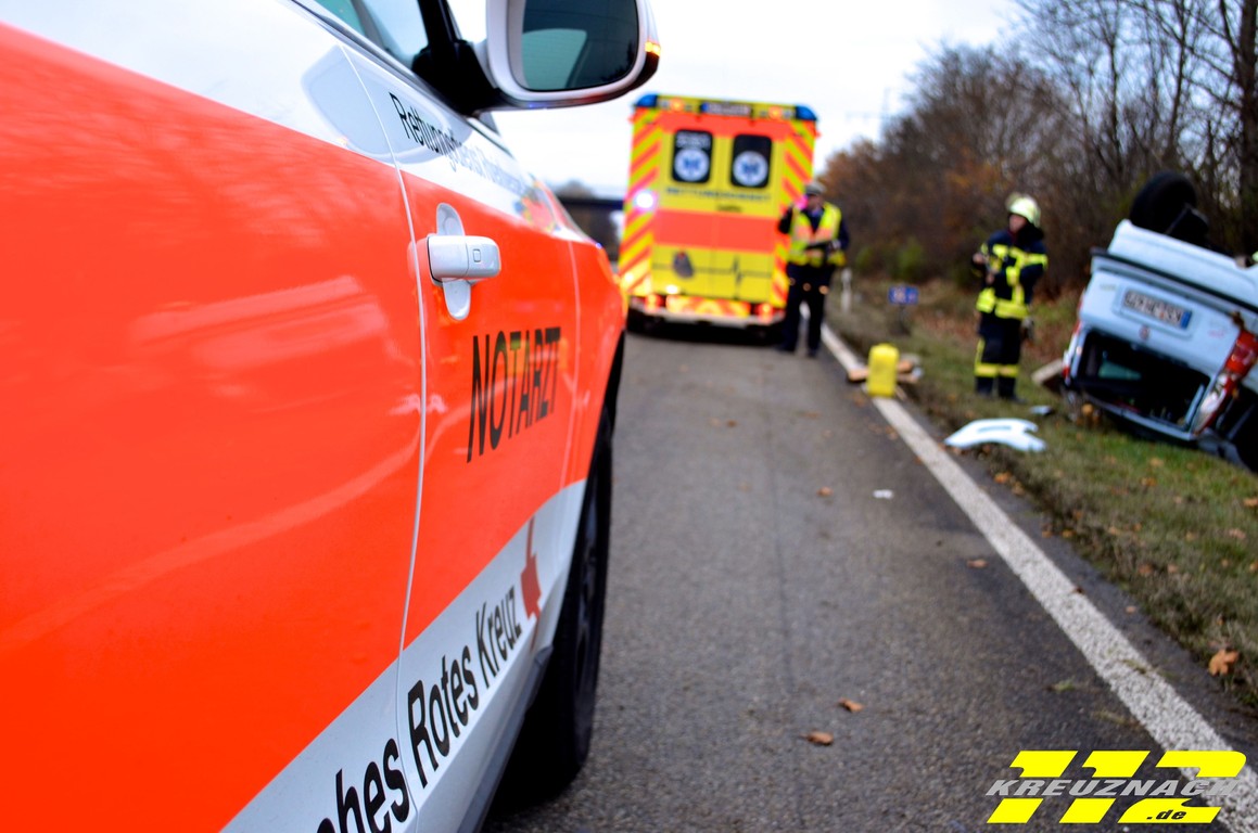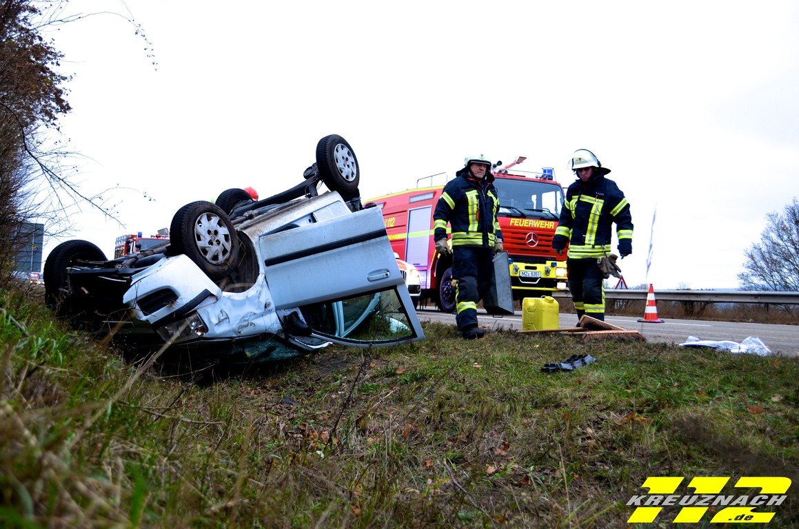 Beifahrerin wurden mit zwei Rettungswagen ins Krankenhaus gebracht. Glücklicherweise erlitten sie aber nur leichtere Verletzungen. Da aus dem kopfüber liegenden Pkw Benzin auslief wurde die Feuerwehr