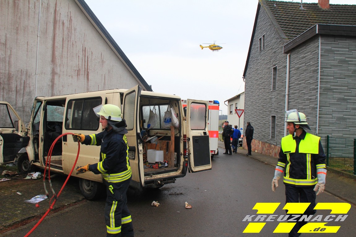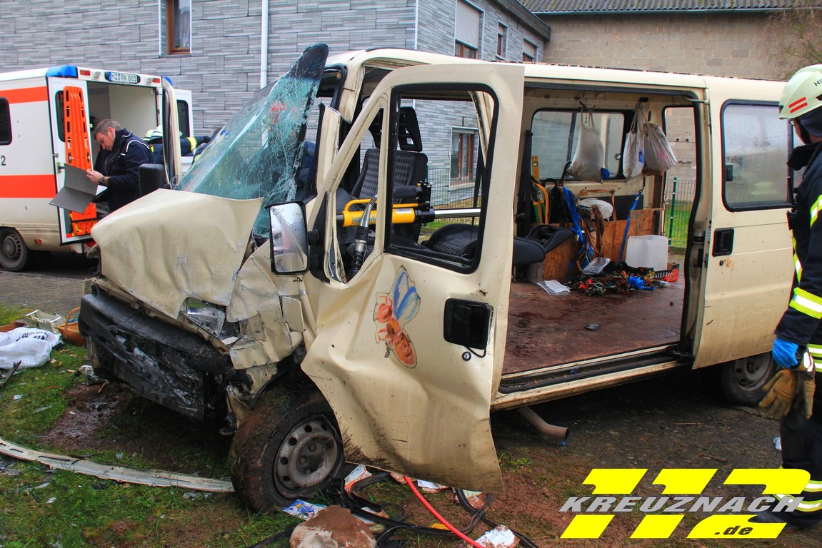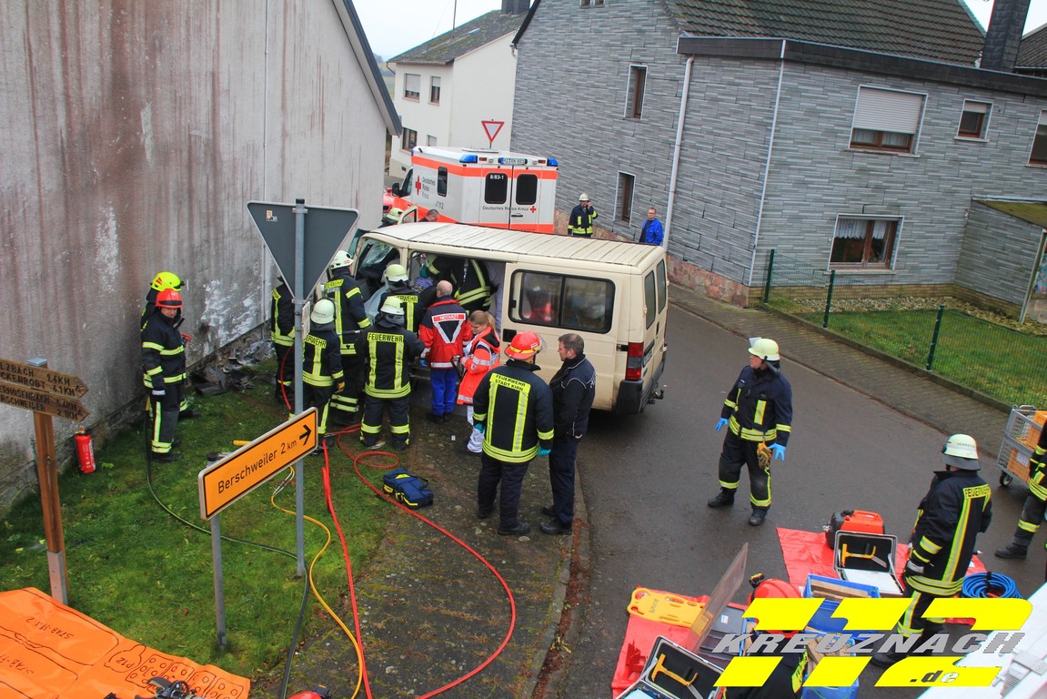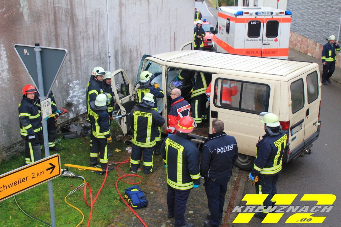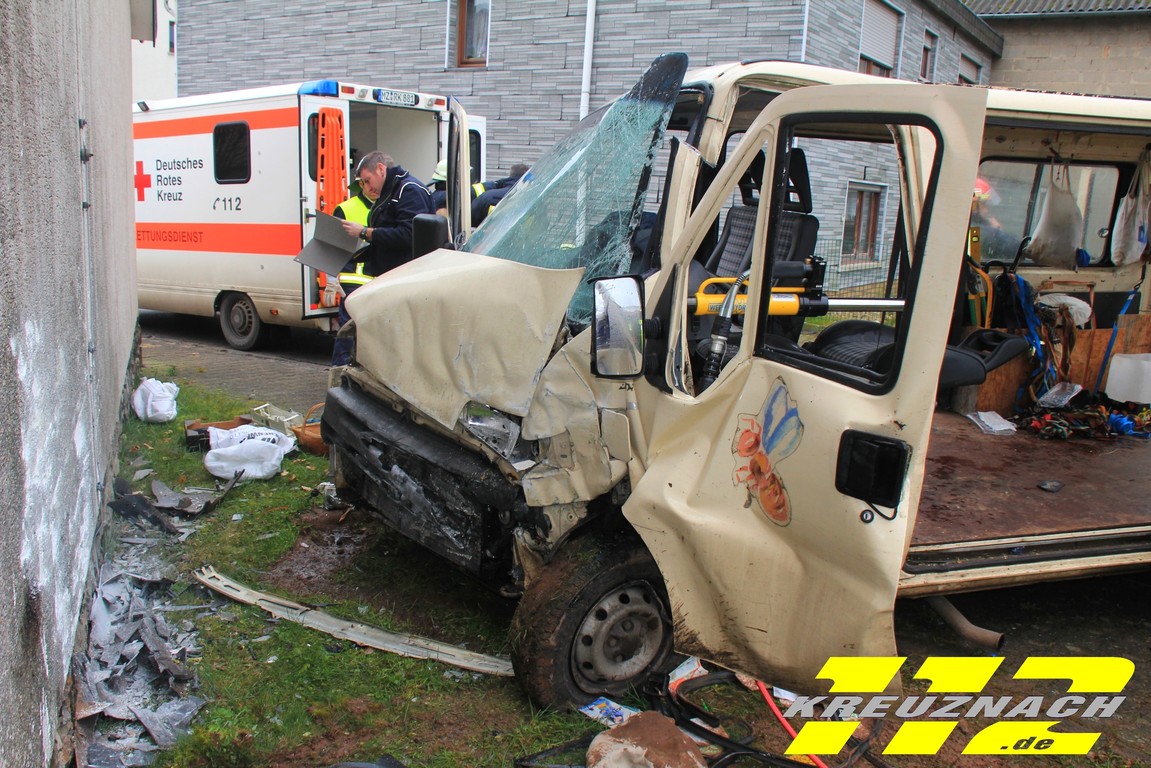 Notarzt aus Kirn. Der Kleintransporter ist mit sehr hoher Geschwindigkeit auf die Hausmauer des Jugendraumes ungebremst aufgefahren. Die Unfallursache war zum Zeitpunkt noch Unbekannt. Der