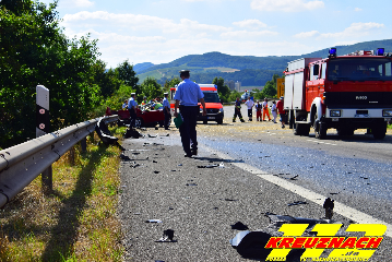 Ein Lkw-Fahrer war in Richtung Bad Kreuznach unterwegs, als ihm auf dem einspurig ausgebauten Streckenabschnitt ein Pkw der Marke Mini entgegenkam. Kurz hinter der Abfahrt Bad-Sobernheim-Westtangente kam es zum Frontalzusammenstoß der beiden Fahrzeuge. Der Mini blieb hierbei total beschädigt in den Leitplanken am rechten Fahrbahnrand stecken. Der Lkw wurde durch die Wucht des Aufpralls nach links über die gesamte Fahrbahn geschleudert. Dort durchbrach er die Leitplanken und blieb mit total beschädigtem Führerhaus auf einem Wirtschaftsweg neben der Böschung liegen. Ein Pkw, welcher in Richtung Kirn unterwegs war wurde in dem Trümmerfeld ebenfalls beschädigt.