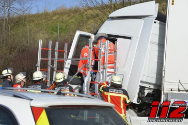 10.01.2017Lkw-Fahrer nach Auffahrunfall auf der A 61 eingeklemmt Reportage Thorsten Gerhardt Schwere Verletzungen erlitt der 41-jährige Fahrer eines Sattelzuges, als er am 10.01.2018 gegen 12.30 Uhr auf einen vor ihm fahrenden Sattelzug auffuhr und in seinem Führerhaus eingeklemmt wurde. Nach dem Aufprall rollte sein Fahrzeug rückwärts und stieß gegen das hinter ihm stehende Auto. Zwischen den Anschlussstellen Waldlaubersheim und Stromberg hatte sich zuvor bei ein-spuriger Verkehrsführung auf der A 61 in Richtung Koblenz wegen Markierungs-arbeiten ein Stau gebildet. Zur Rettung des eingeklemmten Sattelzugfahrers waren zwei Notärzte, ein Rettungshubschrauber und insgesamt 39 Feuerwehr-leute der Freiwilligen Feuerwehren aus Bingen und Stromberg im Einsatz. Die beiden beteiligten Lkw-Fahrer wurden in Krankenhäuser eingeliefert. Über die Schwere der Verletzungen des mutmaßlichen Unfallverursachers sind noch keine genaueren Angaben möglich. Die Sachschäden werden auf 100.000 Euro geschätzt.