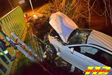 08.03.2017 Unfall: Pkw landet in einem Bach Reportage Thorsten Gerhardt Gestern Abend, kurz vor 21 Uhr, wurden die Feuerwehren Armsheim, Wallertheim und Wörrstadt zu einem Verkehrsunfall in die Bahnhofstraße alarmiert. Nach ersten Angaben ist ein Auto von der Straße abgekommen und über eine Böschung in einen Bach gefahren. Ein Pkw krachte in einen mehrere Meter tiefer fließenden Bach, dabei riß er auch ein Verteilerkasten der Telefon- und Internetverbindung für den Ort ab. Der verletzte Mann wurde Erstversorgt in einem Rettungsfahrzeug und zur Uni nach Mainz transportiert. Der Rettungsdienst vom DRK war mit einem Notarztfahrzeug, einem Rettungswagen und einem Krankenwagen vor Ort. Die Feuerwehr sicherte das Fahrzeug mit einem Mehrzweckzug und stellte den Brandschutz sicher. Da nicht klar war, ob bei der Bergung des Fahrzeuges Öl austritt, wurde eine Ölsperre in die Wiesbach vorsichtshalber gesetzt. Ebenfalls wurde die Unfallstelle Großflächig ausgeleuchtet. Nur durch ein Bergeunternehmen mithilfe eines Krans konnte das Fahrzeug aus der misslichen Lage geborgen werden. An dem Auto ist ein Sachschaden von mehreren tausend Euro entstanden. Die Polizei aus Wörrstadt nahm den Unfall auf. Im Einsatz war die Führungsstaffel mit Wehrleitung der VG Wörrstadt. Die Einsatzleitung von den 50 Einsatzkräften hatte der örtliche Wehrführer Arno Krätschmann. Die Straße in Armsheim musste für rund zwei Stunden komplett gesperrt werden.