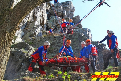 25.03.2017 Bergwacht - Hundestaffel - Sanitätsdienst übten in den Kirner Dolomiten Reportage Sebastian Schmitt Zu einer spannenden und durchaus anspruchsvollen Übung, traten am Samstag rund 50 Einsatzkräfte von Bergwacht, DRK und den Rettungshunden in den Kirner Dolomiten an. Die Welt der Berge hält für ihre Besucher ein breites Spektrum an atemberaubender Schönheit, kontrollierbarem Abenteuer, vielseitigen Sportmöglichkeiten und entspannenden Naturerlebnissen bereit. Doch egal, ob auf einer gemütlichen Wanderung, am Seil in schwerem Fels, nach einem spontanen „Klettertrip“ oder beim Zelten auf dem Freizeitplatz in Oberhausen: objektive und subjektive Gefahren sind ständige Begleiter. Selbst Vorsicht, beste Planung und höchste Erfahrung machen nicht unverletzbar. Ein falscher Schritt, ein Stein, der sich löst, ein Schwächeanfall. Die Palette der unvorhersehbaren Zwischenfälle ist groß. Ist erst einmal etwas passiert, kann schnelle und effiziente Hilfe Leben retten. Aus diesem Grund organisierte die Kirner Bergwacht eine groß angelegte Übung, zum Saisonstart an dem sehr beliebten Kletterfelsen. Mit von der Partie waren die Bergwacht aus Bad Kreuznach und Kirn, die DRK Ortsgruppe Idar, die DRK Rettungshundestaffel und Frank Weger vom DRK Ortsverband Kirn. Übungsannahmen waren drei vermisste Jugendliche, die mit Alkoholverzehr von einer Fete am Grillplatz einen nächtlichen Ausflug in das unwegsame Gelände machten und vermisst wurden. Die Übung startete um 11.00 mit einer kurzen Vorbesprechung und Gruppeneinteilung. Die Einsatzleitung hatte Thomas Meffert von der Bergwacht Rotenfels an. Weiterlesen