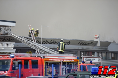 Am gestrigen Donnerstag kam es an einer Lagerhalle eines Getränkegroßhandels in Simmern zu einem Brand, welcher die Lagerhalle fast vollständig zerstörte. Nach derzeitigem Ermittlungsstand wurde der Brand kurz vor 12.00 Uhr mittags bei Schweißarbeiten mit einem Gasbrenner auf dem Flachdach der Lagerhalle verursacht. Der Dachdecker konnte sich vom Dach retten und wurde leicht verletzt in ein Krankenhaus eingeliefert. Der Brand breitete sich schnell auf die gesamte Dachdämmung aus. Es drohte ein Übergreifen auf angrenzende Gebäudeteile, was durch die Feuerwehr jedoch verhindert werden konnte. Es entstand eine erhebliche Rauchentwicklung, die auch in einigen Teilen durch das Stadtgebiet Simmern zog. Die Bewohner wurden über Rundfunk- und Lautsprecherdurchsagen aufgefordert, Fenster und Türen geschlossen zu halten. Im frühen Einsatzverlauf wurde durch die Feuerwehr Simmern die Technische Einsatzleitung nachalarmiert, um die weiteren Maßnahmen koordinieren zu können, da abzusehen war, das dieser Einsatz einen enormen Personal und Materialeinsatz bedarf.