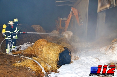 Um 22.10 Uhr meldete ein Autofahrer per Notruf einen Scheunenbrand zwischen Staudernheim und Oberstreit. Die Leitstelle Bad Kreuznach löste darauf mit dem Einsatzstichwort „Scheunenbrand“ ein Großalarm aus. Neben den Einsatzleitern Lothar Treßel als VG-Wehrleiter und Kreisfeuerwehr-Inspekteur Werner Hofmann, wurden die Einheiten Bad Sobernheim, Monzingen, Staudernheim und Oberstreit alarmiert. Die Einheit Oberstreit hatte nur 500 Meter Anfahrt zur der 50 x 30 Meter großen Scheune mit Metallbauweise, beim Eintreffen an der Einsatzstelle gaben Sie eine Rückmeldung. An Hand dieser Information, wurden weitere Tanklöschfahrzeuge aus Waldböckelheim, Rüdesheim und Bockenau nachalarmiert, so dass die Feuerwehr über 30.000 Liter Wasser in Fahrzeugen zur Feldscheune transportierte. Eine zentrale Rolle spielte bei der Löschwasser Versorgung der vom Kreis Bad Kreuznach stationierte Wechsellader, mit einem 9.000 Liter Löschwasser Abrollcontainer. Da der Bau der Scheune noch nicht abgeschlossen ist, wurden die noch im Bau befindlichen und offenen Seitenteile der Scheune von innen mit Rundballen zu gesetzt, um ungebetene Gäste fernzuhalten. Genau hier fing es an zu brennen und Rettungskräfte, die als erstes anfingen zu löschen waren sich sicher: „Das Feuer kam von außen und brach nicht im inneren aus“. Enormer Qualm behinderte die Löscharbeiten, das Stroh und Heu fing immer wieder an zu brennen und qualmte so stark, dass man rund um die Scheune die Sichtweite weniger als 15 Meter betrug. Der Besitzer unterstützte die Feuerwehr mit einem Bagger und einem Traktor, mit dem das brennende Heu aus der Scheune geschafft wurde und im Freien abgelöscht wurde. Der Brand konnte durch das schnelle Eingreifen der Feuerwehr auf eine Fläche von etwa 15 x 15 m begrenzt werden. So blieben die zahlreichen Maschinen, wie Mähdrescher, Traktor oder diverse Anbaugeräte unbeschädigt. Aber am Gebäude entstand erheblicher Sachschaden, da zum Beispiel die Kunststoffoberlichter der Halle durch die enorme Hitze schmolzen und zerstört wurden. Bereits nach 90 Minuten konnten erste Feuerwehreinheiten die Scheune an der Landstraße 234 zwischen Staudernheim und Oberstreit verlassen.