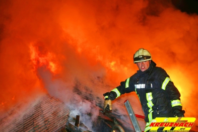 07.04.2017 Großfeuer zerstört Einfamilienhaus Reportage Sebastian Schmitt Bei einem Feuer ist in der Nacht zum Freitag ein Wohnhaus in der VG Herrstein zerstört worden. Als die Feuerwehrleute mit zahlreichen Fahrzeugen unter der Führung von Einsatzleiter Nils Heidrich eintrafen, stand das Erdgeschoss im Vollbrand. Der Vater und seine 2 Jugendlichen Kinder konnten sich im letzten Augenblick ins Freie retten. Das zusammen Spiel der einzelnen Ortswehren und die Einweisung, der nach Rückenden Hilfskräfte klappte tadellos. Auch die Einweisung der 2. Drehleiter aus der Stadt Kirn, die mit 18 Kräften unter Leitung ihres Wehrleiters Michael Wildberger eintrafen, funktionierte dank gemeinsamer Übungen reibungslos. Probleme machte, die ausreichende Löschwassermenge bereit zu stellen. Nach 60 Minuten hatte sich das Feuer in das Dachgeschoss aus gebreitet und es kam zu einer Durchzündung des Dachstuhls. Es schlugen bis zu sechs Meter hohe Flammen aus Dachfenster, Fenstern und sonstige Öffnungen, der Feuerschein und der Brandgeruch waren in großen Teilen der Nachbargemeinden wahrnehmbar. Das Großaufgebot von über 100 Rettungskräften sorgte dafür, dass die rund 200 Schaulustigen den Brandort während des Einsatzes in gebührendem Abstand beobachteten. Die Feuerwehrleute konnten die Flammen durch massiven Wassereinsatz relativ schnell unter Kontrolle bringen. Wie es zu dem Feuer in dem Wohnhaus gekommen war, konnte die Polizei noch nicht sagen. Der Sachschaden ist im sechsstelligen Bereich.