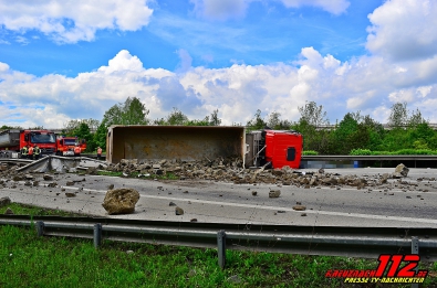 Steinbruch auf der Fahrbahn verteilt wurde. Die Schilderbrücke in der