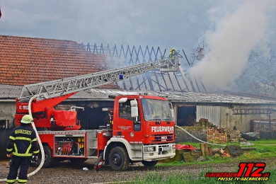 14.05.2017 Scheune geht in Flammen auf - nach Unwetter Reportage Thorsten Gerhardt Orbis - Vermutlich ein Blitzeinschlag ist verantwortlich für einen Scheunenbrand, zu dem Sonntagnachmittag die Freiwillige Feuerwehren der Verbandsgemeinde Kirchheimbolanden nach Orbis ausgerückt ist. Zusätzlich wurden die Feuerwehr Göllheim und Alzey zur Unterstützung nachalarmiert. Verletzte gab es keine. Es entstand aber beträchtlicher Sachschaden. Nur durch das schnelle eingreifen der Feuerwehr konnte das Übergreifen der Flammen auf weitere Gebäudeteile verhindern werden. Das Alzeyer THW wurde für die Ausleuchtung der Einsatzstelle alarmiert, hierzu kam ein großer Notstromanhänger mit Lichtmast, da die Nachlöscharbeiten bis in den späten Abend dauerte. "Wir müssen mit 2 Drehleitern die verbrannten Dachbalken absägen und abtragen, mit der Absturzsicherungseinheit" so Einsatzleiter Sascha Angst. Das Stroh musste auseinander gezogen werden, damit man die restlichen Glutnester ablöschen konnte. Im Einsatz war das DRK Rockenhausen mit ihrem Brandschutz Rettungswagen (RTW). Dieser RTW mit Besatzung löst den Regelrettungsdienst aus dem Brandeinsatz aus, damit das Fahrzeug weiter im Einsatzgebiet genutzt werden kann. Der Kreisfeuerwehrinspekteur Christian Rossel und sein Stellvertreter Thorsten Schüdzig machten sich ein Bild der Lage vor Ort.
