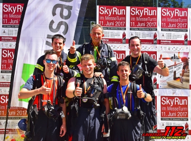 11.06.2017 Gensinger Feuerwehrleute rennen den Frankfurter Messeturm (61 Stockwerke) hoch Reportage Thorsten Gerhardt Der SkyRun MesseTurm Frankfurt am heutigen Sonntag ist ein spektakulärer Charity-Treppenlauf bis zur Spitze des Frankfurter Messe Turms! Die Startgebühren kommen dem gemeinnützigen Verein ARQUE zugute, der sich für die Interessen von Menschen mit angeborener Querschnittslähmung und Störung des Gehirnwasserkreislaufs einsetzt. Erstmal sind 2 Teams der Feuerwehr Gensingen angetreten. Einzelläufer und Teams können Frankfurts Wahrzeichen mit seinen 61 Stockwerken um die Wette hinaufstürmen; dabei sind 1.202 Stufen und 222 Höhenmetern zu bezwingen. Gestartet ist das Team darunter Marvin Müller, Dominik Joosten, Max Pitthan, Willibald Dory, Andreas Dietz und Heiko Laux im FireFighterCup Elite. Dies bedeutet, dass man die Strecke in vollständiger Brandschutzkleidung mit angeschlossenem Atemschutzgerät (20 Kilo) zurücklegt. Nach endlosen Treppengeländern und der ständigen Aussicht auf weißen Beton kamen alle, mit mehr oder weniger Luft in den Atemluftflaschen, erfolgreich oben an.