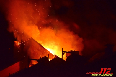 Flammen aus dem Dach des Mehrfamilienhauses. Mehrere Bewohner befanden sich noch im Gebäude. Die Familie der Brandwohnung konnte sich in Sicherheit bringen. Das Gebäude war wegen Dacharbeiten