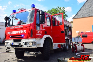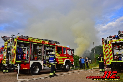 04.07.2017 Gebäudebrand in Ippesheim Reportage Thorsten Gerhardt Bereits auf der Anfahrt am Freitagabend gegen 19 Uhr, wies eine schwarze Rauchsäule den Einsatzkräften den Weg zur Einsatzstelle in der Nähe des Ippesheimer Weihers. Ein ehemaliges Gewächshaus mit einer Größe von 10 m x 30 m, in dem etwa 70 Rundballen Heu und technisches Material gelagert wurden, stand in Vollbrand. Die Flammen schlugen seitlich und auf der Rückseite aus den zerborstenen Scheiben und drohten auf benachbarte Hallen und Wohnhäuser überzugreifen. Sofort wurde Vollalarm für alle 4 Löschbezirke der Stadt Bad Kreuznach ausgelöst. Es wurden 2 Einsatzabschnitte gebildet. Die Löschbezirke Ost und West bekämpften den Brand von der Ostseite der Halle und riegelten die Flammen zu den benachbarten Wohngebäuden und Garagen ab. Die Löschbezirke Süd und Nord nahmen die Brandbekämpfung von der Rückseite der Halle aus vor und verhinderten mit einer Riegelstellung ein Übergreifen der Flammen zur benachbarten Halle. Insgesamt wurden 7 C-Rohre und knapp 20 Trupps unter schwerem Atemschutz nacheinander eingesetzt, um den Brand zu löschen. Ein Übergreifen der Flammen auf Nachbargebäude konnte durch das rasche Eingreifen der Wehrleute verhindert werden. Zunächst wurde das Löschwasser aus den vielen vor Ort befindlichen Löschfahrzeugen entnommen. Dann wurde eine Löschwasserversorgung aus dem nahe liegenden Weiher aufgebaut. 7 Personen erlitten Rauchvergiftung. Davon mussten 4 Personen (darunter ein Kleinkind) zur weiteren Untersuchung in ein Krankenhaus gebracht werden. 2 Feuerwehrleute verletzten sich leicht, konnten aber ihren Dienst vor Ort nach kurzer Behandlung durch den Rettungsdienst, der mit einem Großaufgebot angerückt war, wieder fortsetzen. Etwa 50.000 l Wasser und 260 l Schaummittel, das als Netzmittel dem Löschwasser beigemischt wurde, wurden zur Brandbekämpfung eingesetzt. Mit einem Radlader wurden die brennenden Heuballen aus der Halle geholt und auf eine Wiese gefahren. Dort wurden sie gründlich abgelöscht. Das Wohnhaus war leicht verraucht und wurde durch die Einsatzkräfte mit einem Belüftungsgerät entraucht. Das THW versorgte die Fahrzeuge und Aggregate mit einer mobilen Tankstelle vor Ort mit Kraftstoff. Die Verpflegungseinheit des Rettungsdienstes versorgte die Einsatzkräfte mit Brötchen und Getränken. Nach etwa 8 Stunden rückten alle Kräfte ab, bis auf eine Brandwache, die von den Ippesheimer Wehrleuten gestellt wurde. Diese behielt die Einsatzstelle die Nacht über weiter im Auge. Einsatzleiter war Peter Steinbrecher (Zugführer Löschbezirk Ost) mit 82 Einsatzkräften der Feuerwehr und 16 Fahrzeugen.