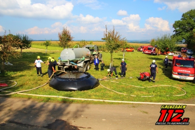 23.09.2017 Großübung Waldbrand in Rohrbach Reportage Sebastian Schmidt Mit einer Übung im Rohrbacher Wald haben die Wehren der Verbandsgemeinde Kirchberg mit 160 Einsatzkräften am Samstag den Einsatz unter erschwerten logistischen Bedingungen geprobt. Unterstützt wurden sie durch ihre Kameraden aus Rheinböllen und der Stadt Kirn. Ein Waldbrand oberhalb des Freizeitplatzes, der 184 Einwohner Gemeinde Rohrbach – das war das Ausgangsszenario der Übung. Verbandsgemeinde Wehrleiter, Oliver Socha, hatte das „Drehbuch“ für den Einsatz ausgearbeitet. Dabei ging es in erster Linie darum, Löschwasser im Ort und verschiedenen Wasserstellen im Wald zu tanken, in die Nähe des Brandherds zu transportieren und dabei die Einsatzkräfte so zu versorgen, dass Wasser ohne Unterbrechung zur Verfügung stand. Gegen 13:15 Uhr wurden die Kameraden aus Gemünden und Rohrbach alarmiert, weil das vorbereitete Szenario, aber umfangreich ausgelegt war, sind anschließend die Wehren aus Sohren-Büchenbeuren, Kirchberg, Rödelhausen, Dickenschied, Niederweiler, Woppenroth, Dillendorf, Lindenschied, Gehlweiler, Rheinböllen, Roth und Hecken nach Rohrbach ausgerückt. Nach dem verehrenden Hochwasser in Gemünden im Juni 2016, wo die Feuerwehren Hennweiler und Kirn, ebenfalls zur Unterstützung kamen, einigten sich die zwei Wehrleiter Michael Wildberger (Kirn) und Oliver Socha (VG Kirchberg) auf eine zukünftige gute Zusammenarbeit. So kamen die Kirner ebenfalls mit 3 Fahrzeugen, ihr Anfahrtsweg nach Rohrbach betrug lediglich 17 Kilometer. „Ein Waldbrand ist immer eine Materialschlacht“, erklärte der Gemündener Wehrführer Manuel Moog, das Übungsszenario, bei dem insgesamt 30 Fahrzeuge mit über 160 Feuerwehrangehörigen im Einsatz waren. Die Tanklöschfahrzeuge von Kirchberg, Kirn und Rheinböllen mit je 5000 Liter, das Hilfeleistungslöschfahrzeug Sohren-Büchenbeuren mit 2000 Liter Fassungsvermögen, verschiedene Landwirte mit Wasserfässern, waren permanent im Einsatz, um den Löschangriff kontinuierlich zu gewährleisten. Aus den Tanks der Fahrzeuge wurde das Wasser zunächst in einen großen Plastikauffangbehälter gepumpt und dann mithilfe einer tragbaren Pumpe an die Einsatzstelle weitergeleitet. Wie Wehrleiter Oliver Socha erklärte, reicht eine Wagenladung bei voller Auslastung der eingesetzten Rohre gerade mal für vier bis fünf Minuten. „Es geht darum, das Gleichgewicht herzustellen zwischen dem, was rausgeht, und reingefahren werden kann“. Und dies ist den Wehren hervorragend gelungen, wie der Wehrleiter nach Abschluss der Übung feststellte. Socha verglich die übenden Einheiten mit Fußballspielern: „Jeder für sich kann gut spielen, aber es braucht viel Training, damit auch das Zusammenspiel funktioniert.“ Man habe bewusst die Einheiten gemischt, um so die gemeinsame Aufgabenbewältigung zu üben. Neben zwei Wasserstellen an Hydranten in Dickenschied und Rohrbach, wurden zwei vollgelaufene Bergwerksstollen als Wasservorrat angezapft. Abschnittleiter Michael Fladung, baute mit 5 Ortswehren vom Schieferstollen eine Schlauchleitung auf: „Leider hat es sich bei dem kleinen Stollen nicht gelohnt, wir holten nur 17.500 Liter Wasser aus dem alten Bergwerk, dies wäre bei einem größeren Brand viel zu wenig“, so Fladung. Ebenfalls angezapft wurde der Bergwerksstollen am Freizeitplatz Lindenschied, hier senkte sich der Wasserpegel trotz Dauerentnahme, nur unwesentlich. Insgesamt wurden 1200 Meter Schläuche verlegt und 42.000 Liter Wasser zum fiktiven Brand transportiert. Wegen den Spätsommerlichen warmen Temperaturen, wurde die Schutzausrüstung auf Helm und Handschuhe reduziert.